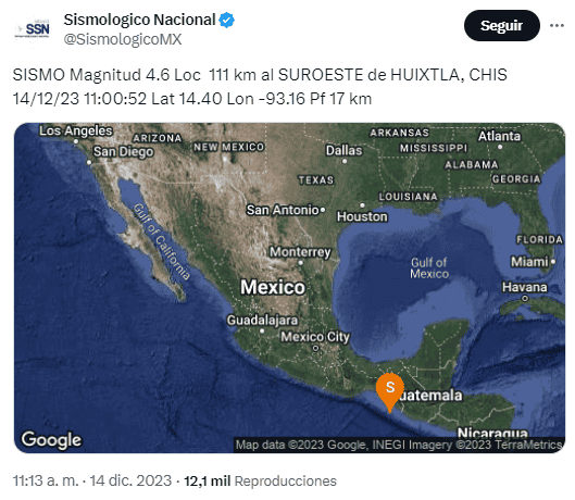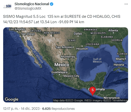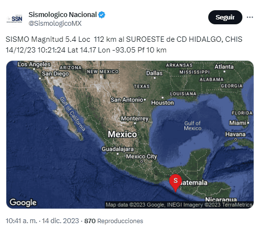 Este jueves 14 de diciembre se registró un temblor frente a costas del estado de Chiapas.Según el Servicio Sismológico Nacional (SSN), el temblor tuvo una magnitud preliminar de 5.3, y tuvo epicentro a 87 km al suroeste del municipio de Huixtla.El sismo ocurrió a las 10:21 horas, a una profundidad de 10 kilómetros. Más adelante, el SSN ajustó a magnitud 5.4 el sismo. También indicó que el epicentro fue a 112 km al suroeste del municipio de Ciudad Hidalgo.Posteriormente, el SSN registro otros sismos. Uno a las 11:00 horas, de magnitud 4.6, con epicentro en Ciudad Hidalgo, Chiapas. Y uno más de 5.5, en el mismo lugar, a las 11:54. Hasta el momento no han aclarado si se trata de réplicas del primer temblor.La Coordinación Nacional de Protección Civil dijo en su cuenta de X (antes Twitter) que partir de estos eventos, mantiene comunicación con las unidades estatales y municipales para realizar una evaluación preliminar de la zona. De momento no se reportan daños.Hoy también se reportaron dos microsismos más pasadas las 14:00 horas en la Ciudad de México, uno de estos de magnitud 3.2 y el otro de 2.4, confirmado por el SSN.En el actual mes de diciembre se han registrado diversos movimientos telúricos en el país. Los más destacados son los microsismos del pasado 12 de diciembre registrados en la CDMX.Además, se registró otro temblor con epicentro en Michoacán el mismo día.*Mantente al día con las noticias, únete a nuestro canal de WhatsAppOF
