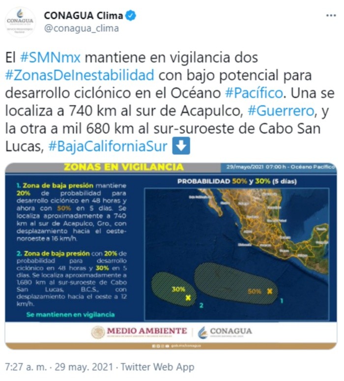 El Servicio Meteorológico Nacional (SMN) de México informó el viernes que vigila dos zonas de inestabilidad con potencial para desarrollo ciclónico, en el pronóstico a 48 horas, en el Océano Pacífico.En un comunicado, el SMN señaló que a las 07:00 horas de este sábado, la primera formación, con un 50% de probabilidad para formar un ciclón tropical en el pronóstico a 48 horas, se localizó a 740 kilómetros (km) al sur de Acapulco, Guerrero.Mientras que la segunda, con un 20% de probabilidad para formar un ciclón tropical en el pronóstico a 48 horas y 30% en cinco días, se localizó a mil 680 km de Cabo San Lucas, Baja California Sur.Además, indicó que para el sábado se esperan lluvias muy fuertes en Chiapas y fuertes en Chihuahua, Coahuila, Guanajuato, Guerrero, Nuevo León, Oaxaca, San Luis Potosí, Tamaulipas y Zacatecas.Las lluvias pronosticadas estarán acompañadas de descargas eléctricas y se prevén condiciones para la caída de granizo en Chiapas, Chihuahua, Coahuila, Durango, Guanajuato, Nuevo León, San Luis Potosí, Tamaulipas y Zacatecas.El SMN señaló que debido a las precipitaciones podría haber deslaves, incremento en los niveles de ríos y arroyos, y desbordamientos e inundaciones en zonas bajas.Ante ello recomendó a la población de los estados mencionados y a la navegación marítima atender los avisos y seguir las indicaciones de las autoridades estatales, municipales y de Protección Civil.En el resto de la República Mexicana, otro canal de baja presión y el ingreso de humedad proveniente de la zona de inestabilidad con probabilidad ciclónica que se localizará al sur de las costas de Guerrero, también en el Pacífico, generarán los efectos descritos.La Comisión Nacional del Agua (Conagua), de la que depende el SMN, pronosticó a mediados de mayo la formación de entre 14 y 20 sistemas con nombre en el océano Pacífico, mientras que para el Atlántico previó de 15 a 19 fenómenos.OF
