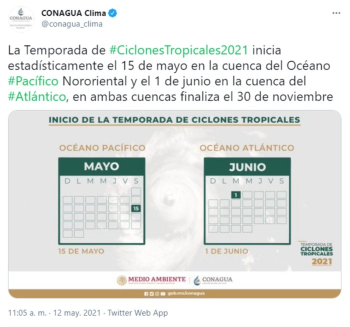 Las autoridades de México pronosticaron este miércoles hasta 39 ciclones con nombre para 2021, por lo que la temporada de lluvias, de nuevo, ''estará por encima del promedio'' tras adelantarse en tiempo récord.Aunque el inicio oficial de la temporada es el 15 de mayo, la tormenta tropical ''Andrés'' surgió el 9 de mayo, por lo que es ''la formación más temprana en el Pacífico'', indicó Blanca Jiménez, titular de la Comisión Nacional del Agua (Conagua), en rueda de prensa.''El récord previo lo tenía la tormenta tropical ''Adrián'', la cual abrió el 10 de mayo de 2017. Además, este es el segundo año consecutivo en el Pacífico con formación ciclónica antes del inicio oficial de la temporada de lluvias y ciclones tropicales'', comentó.La Conagua pronosticó entre 15 y 19 sistemas con nombre en el océano Atlántico, de los que entre ocho y 12 serán tormentas tropicales, entre cuatro y cinco huracanes de categoría 1 o 2, y de tres a cuatro huracanes de categoría 3 a 5.Para el Pacífico, donde se ubica Jalisco, previó de 14 a 20 sistemas con nombre, de los que entre siete y 10 serán tormentas tropicales, tres a cinco huracanes categoría 1 o 2, además de cuatro a cinco de categoría 3 a 5.''Considerando que el número de impactos promedio en el país es de cuatro a cinco y que en ambos litorales se pronostica actividad por arriba del promedio, estamos previendo contar con entre cinco a siete impactos en territorio nacional para 2021'', consideró Jiménez.Estos pronósticos se revelan después de que México vivió la temporada de ciclones "más activa de la historia" en 2020, con 46 fenómenos, de los que 29 fueron tormentas tropicales y 17 huracanes, nueve de ellos de gran intensidad.Pero además se difunden mientras el 85% del territorio mexicano afronta condiciones de sequía, según la Administración Nacional de Aeronáutica y el Espacio de Estados Unidos (NASA, en inglés)."Los fenómenos asociados a la presencia o ausencia de agua representan el 90% de las pérdidas o daños causados por las amenazas que ocurren en México", advirtió Laura Velázquez, directora de la Coordinación Nacional de Protección Civil (CNPC).Los factores "que determinan la ocurrencia y los daños de los fenómenos meteorológicos se han multiplicado", reconoció Rosa Icela Rodríguez, titular de la Secretaría de Seguridad y Protección Ciudadana (SSPC)."Por lo que enfrentamos situaciones cada vez más complejas, el cambio climático está generando los eventos más atípicos y severos con un mayor impacto", añadió la secretaria.Este será, además, el primer año en el que México no contará con el Fondo de Desastres Naturales (Fonden), que el Presidente Andrés Manuel López Obrador (AMLO) pidió eliminar por su política de "austeridad republicana".Aun así, la Secretaría de la Defensa Nacional (Sedena) afirmó que tienen 80 mil 500 hombres listos para atender la emergencia, mientras que el secretario de Marina, José Rafael Ojeda, pidió a las zonas costeras reforzar la prevención."En muchos estados costeros lo que falta es un poco de voluntad por parte de los presidentes municipales o de los gobernadores, que estén atentos, la prevención nos ayuda", indicó el almirante Ojeda.OF