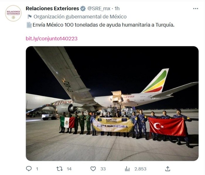 La noche de este martes, un avión cargado con 100 toneladas de ayuda humanitaria partió del Aeropuerto Internacional "Felipe Ángeles" (AIFA) con destino a Turquía."Esta ayuda humanitaria, que será destinada para la población afectada por los devastadores terremotos que se registraron hace una semana, es la respuesta de solidaridad que los mexicanos hicieron a la convocatoria que realizó el Gobierno de México y la Embajada de Turquía en nuestro país", señalaron en un comunicado conjunto la Secretaría de la Defensa Nacional (Sedena) y la Cancillería.Entre los insumos se encuentran alimentos en general, cobijas, colchonetas, casas de campaña, generadores de luz, insumos médicos, insumos de higiene personal y ropa.Para supervisar la actividad, acudieron al AIFA el general de Brigadier Diplomado de Estado Mayor Arody Salvador Lorenzo, en representación de la Sedena, el embajador de Turquía en México, İlhan Kemal, y la directora ejecutiva de la Agencia Mexicana de Cooperación Internacional para el Desarrollo (Amexcid), Laura Elena Carrillo, quienes estuvieron presentes en la carga y despegue de la aeronave.Como responsables del traslado de los insumos al aeropuerto de Adana, Turquía, fueron designados por la Sedena el teniente coronel Fuerza Aérea Piloto Aviador Diplomado de Estado Mayor Aéreo, José Manuel Herrera, así como la directora general de Ejecución de Proyectos en el Exterior de la Amexcid, Gloria Sandoval Salas.JM