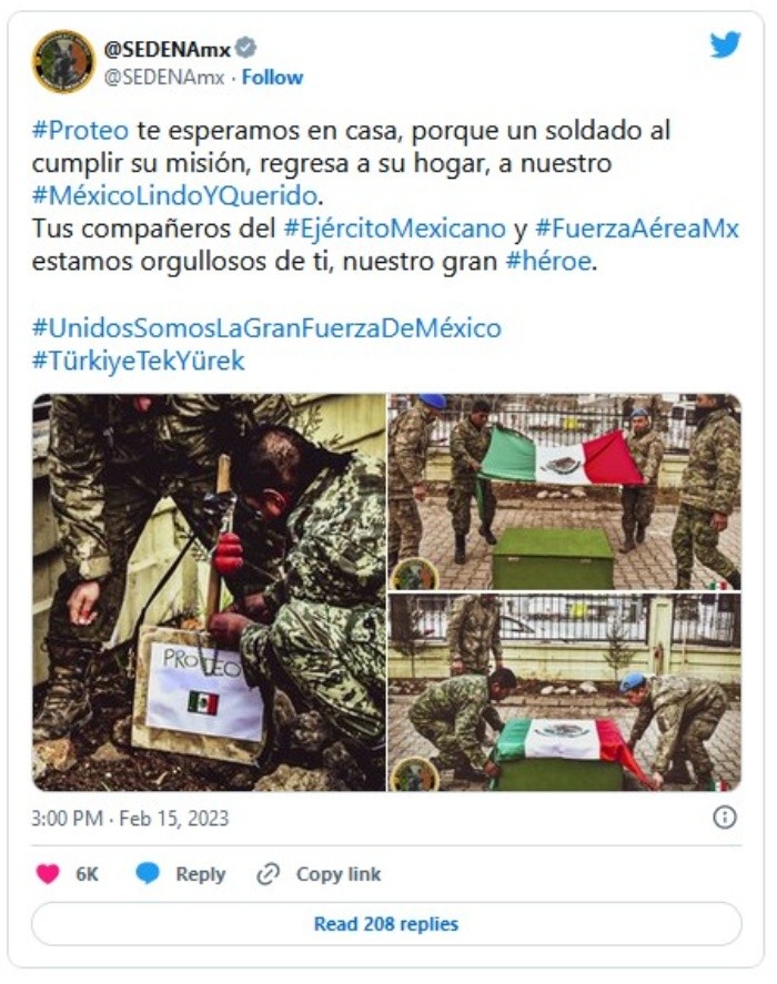Alrededor de las 12:30 horas se tiene previsto que arribe a la Base Militar No 1 en Santa Lucía, en el Estado de México, la delegación mexicana que apoyó en los trabajos rescate en Turquía tras el sismo de 7.8 grados ocurrido el pasado 6 de febrero.En redes sociales, la Secretaría de la Defensa Nacional (Sedena) invitó a la población a que acuda a Santa Lucía para dar la bienvenida a los efectivos y rendir un homenaje a "Proteo", el héroe de cuatro patas que murió en el país del Medio Oriente."Demos un último adiós a un gran héroe. Acompáñanos a recibir a nuestros hermanos de la delegación Mexicana que apoyó en los trabajos de Búsqueda y Rescate en Turquía. Rindamos un merecido homenaje a nuestro compañero 'Proteo' ", señaló la dependencia.El perro, quien perdió la vida a las 16:45 horas del 10 de febrero de 2023, nació el 16 de junio de 2013, perteneció a la Primera Brigada de Policía Militar, en el Campo Militar No. 1-A, Ciudad de México y fue seleccionado para ser enviado a Turquía por su alto grado de adiestramiento alcanzado y su experiencia en actividades de Búsqueda y Rescate de personas.En su última labor de ayuda humanitaria en Turquía, el lomito apoyó en el rescate con vida de un menor y la recuperación de 14 cuerpos.De acuerdo con la Sedena, a las 9:47 horas del 11 de febrero del presente año (horario de Turquía) integrantes de la delegación Mexicana llevaron a cabo una ceremonia para reconocer la loable labor que realizó en beneficio del pueblo de México y de países hermanos.De acuerdo con Carlos Villeda Máquez, entrenador de "Proteo", la muerte del lomito ocurrió por diversos factores, entre ellos la edad (estaba cerca de cumplir 10 años) y el clima extremadamente frío que se mantiene en Turquía; descartó que el deceso ocurriera debido al derrumbe de un edificio como en un inicio se manejó.JM