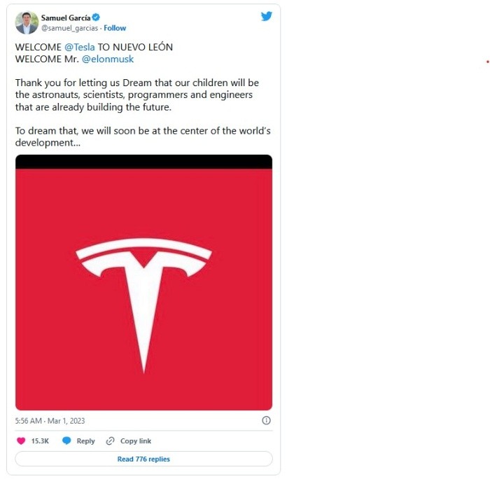 Luego de que el Presidente Andrés Manuel López Obrador anunciara que la planta automotriz de Tesla se instalará en Monterrey, Nuevo León, acuerdo al que llegó con Elon Musk, el gobernador de la Entidad, Samuel García Sepúlveda, dedicó un emotivo mensaje al magnate sudafricano.Por medio de Twitter, el gobernador le dio la bienvenida al dueño de SpaceX."BIENVENIDOS @Tesla A NUEVO LEÓN. BIENVENIDO Sr. @elonmusk. Gracias por dejarnos soñar que nuestros hijos serán los astronautas, científicos, programadores e ingenieros que ya están construyendo el futuro. Soñar que pronto estaremos en el centro del desarrollo del mundo…", se lee en la publicación de Samuel García, acompañada de una imagen del logo de Tesla.En abril del año pasado, Samuel García realizó una gira de trabajo en Texas, en la que visitó la planta de Tesla en Austin.En un video en sus redes sociales, Samuel García destacó que se refrendó un acuerdo de "que todo el ensamble de productos, toda la exportación de carros que se hacen en California y en Texas van a usar el Puente Colombia".Además, destacó que varios proveedores de Tesla operan desde Nuevo León. "Todo el aluminio que se usa para la fabricación de autos Tesla viene de una empresa de Nuevo León".Samuel García también mencionó a la empresa Quanta Computer, dedicada a la fabricación de componentes electrónicos para dichos autos.JM
