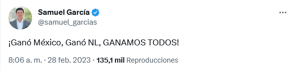 Luego de confirmarse que la planta de Tesla será instalada en Nuevo León, el gobernador de aquel estado, Samuel García lanzó un tuit celebrando la noticia: "¡Ganó México, Ganó NL, GANAMOS TODOS!".El gobernador de Nuevo León lanzó un tuit celebrando el anuncio que hizo esta mañana en su conferencia mañanera el Presidente Andrés Manuel López Obrador.López Obrador anunció que la planta de Tesla, empresa del multimillonario Elon Musk, será instalada en la ciudad de Monterrey."Van bien las cosas, platicamos ayer con el señor Elon Musk, el director de Tesla. Hay ya un entendimiento, sí van a dedicar la inversión a México y se va a establecer la planta en Monterrey, con una serie de compromisos para enfrentar el problema de la escasez del agua. Ellos van ayudar en este sentido".En abril del año pasado, el gobernador Samuel García realizó una gira de trabajo en Texas en la que visitó la planta de Tesla en Austin.En un video en sus redes sociales, el gobernador destacó que se refrendó un acuerdo de "que todo el ensamble de productos, toda la exportación de carros que se hacen en California y en Texas van a usar el Puente Colombia".Además, destacó que varios proveedores de Tesla operan desde Nuevo León. "Todo el aluminio que se usa para la fabricación de autos Tesla viene de una empresa de Nuevo León".Samuel García también mencionó a la empresa Quanta Computer, dedicada a la fabricación de componentes electrónicos para dichos autos.En julio de 2022, Samuel García colocó la primera piedra de la nueva planta de Quanta Computer.Meses más tardes, en octubre de 2022, Elon Musk visitó Nuevo León donde se reunió con el gobernador y algunos funcionarios de su gabinete. Desde ese entonces trascendió que el empresario buscaba establecer operaciones en el país.OF