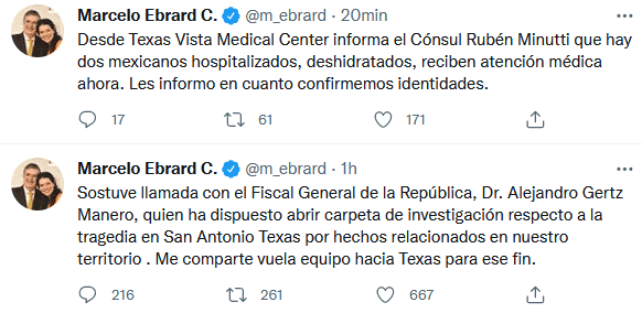 El canciller mexicano, Marcelo Ebrard, informó hoy que además de los 50 connacionales fallecidos en la tragedia del tráiler abandonado en San Antonio, Texas, hay otros dos hospitalizados.Vía Twitter, Ebrard identificó a los mexicanos como Haneydi Yasmin Antonio Guzmán y José Luis Vasques, originarios de Chiapas y Oaxaca, respectivamente.Explicó que son atendidos en el Texas Vista Medical Center."Están deshidratados y reciben atención médica ahora".El cónsul de México en San Antonio, Rubén Minutti, ha visitado los hospitales a donde fueron trasladados 16 migrantes que sobrevivieron a la tragedia, y que estaban afectados por golpes de calor.OA