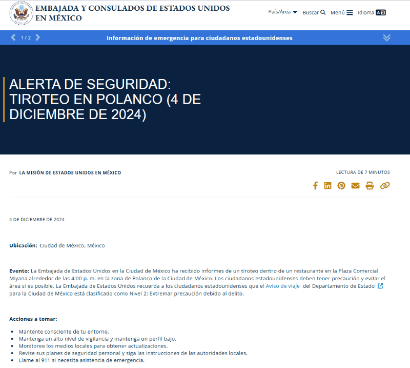 La Embajada de Estados Unidos en México emitió una alerta tras un tiroteo ocurrido en Polanco, en el que se registró una persona muerta. Según informó la misión diplomática, el tiroteo tuvo lugar en un restaurante dentro de la plaza comercial Miyana, en la zona de Polanco, alrededor de las 4:00 p.m. en la Ciudad de México.La Embajada instó a los ciudadanos estadounidenses a tener precaución y evitar la zona si es posible. Además, recordó que el Aviso de viaje del Departamento de Estado para la Ciudad de México está clasificado en Nivel 2: Extremar precaución debido al crimen. Entre las recomendaciones dadas, se incluye mantenerse alerta y consciente del entorno, mantener un perfil bajo, y estar al tanto de las actualizaciones a través de los medios locales. También aconsejó revisar los planes de seguridad personal y seguir las instrucciones de las autoridades locales. En caso de necesitar asistencia, se indicó llamar al 911. Un hombre fue ejecutado mientras comía dentro de un restaurante en la laza comercial Miyana en Polanco; también se reporta otra persona lesionada.De acuerdo a los primeros reportes policiacos, la tarde de este miércoles, en el cruce de las calles Miguel de Cervantes Saavedra y Moliere, en la alcaldía Miguel Hidalgo, sujetos armados ingresaron hasta el local comercial denominado “El Bajío” y sin mediar palabra, dispararon en varias ocasiones contra uno de los comensales para después emprender su huida con rumbo desconocido. EE