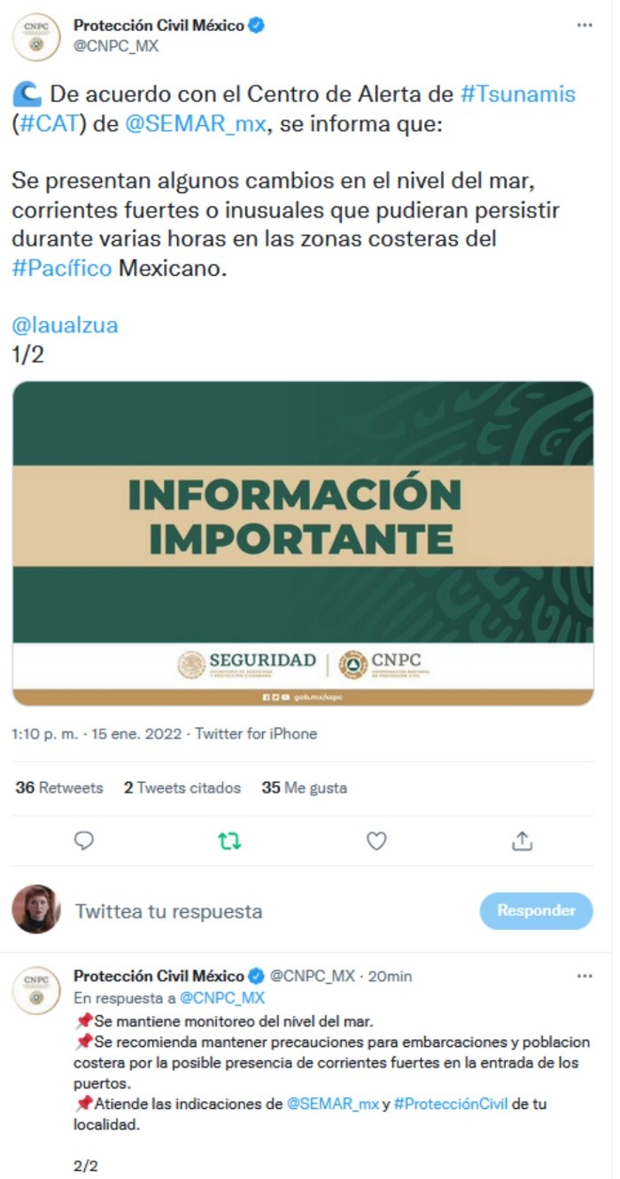A través de sus redes sociales, la Coordinación Nacional de Protección Civil informó que las costas del Pacífico de México han registrado "una ligera elevación del mar la mañana de este sábado", luego de la explosión de un volcán submarino cercano a Tonga, país de Oceanía, en estados como Baja California y Colima.El organismo indicó que se mantiene monitoreo del nivel del mar, mientras que se recomienda mantener precaución a embarcaciones y la población de la costa, por la posible presencia de corrientes fuertes en la entrada de los puertos. Exhortan a seguir las indicaciones de la Secretaría de Marina (Semar) y Protección Civil en la localidad correspondiente.La mañana de este sábado, alertas de tsunami fueron emitidas para las costas del Pacífico de diversos países, tras la erupción del volcán Hunga Tonga-Hunga Ha'apai en Tonga. Hasta hace algunas horas circularon en redes sociales videos de las aguas del mar que ingresaron a tierra en Tonga, pero también ya han sido difundidas grabaciones de otros países como Japón y Chile.OF