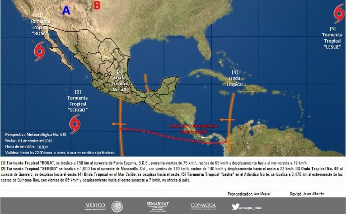 La Comisión Nacional del Agua (Conagua) informó hoy que la tormenta tropical "Sergio" alcanzará la categoría de huracán en el transcurso del día y se ubicará al suroeste de las costas de Jalisco. Añadió que su amplia circulación reforzará el potencial de tormentas en el occidente del país, sin embargo, se desplazará hacia el oeste, alejándose de costas nacionales. Apuntó que la activa onda tropical 40 recorrerá el sur, centro y oriente del territorio nacional, en tanto que inestabilidad superior afectará el occidente, noreste, oriente y sureste del país. Señaló que para hoy se prevé que el centro de la tormenta tropical "Rosa" ingrese sobre Baja California durante la tarde, originando potencial de tormentas muy fuertes a puntuales intensas en el oriente de Baja California y el noroeste de Sonora, además de oleaje de dos a cuatro metros en las costas occidentales de la Península de Baja California. Indicó que los sistemas meteorológicos mencionados, en interacción con la abundante entrada de humedad por ambos litorales, provocarán potenciales de lluvias, las cuales estarán acompañadas de actividad eléctrica y posibles granizadas. Asimismo, se prevén tormentas puntuales intensas acompañadas de actividad eléctrica y vientos fuertes en Baja California y Sonora, por el paso de la tormenta tropical Rosa.JB
