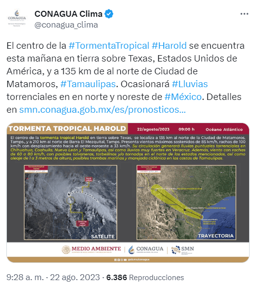 El Servicio Meteorológico Nacional (SMN) informó en su último reporte que a las 09:00 horas, tiempo del centro de México, la tormenta tropical "Harold" tocó tierra sobre Texas, Estados Unidos, y de momento se localiza a 135 kilómetros al norte de la ciudad de Matamoros y a 210 km al norte de Barra El Mezquital, ambos municipios de Tamaulipas, con vientos sostenidos de 85 kilómetros por hora (km/h) y rachas de 100 km/h y desplazamiento hacia el oeste-noroeste a 33 km/h.En su reporte, el SMN indica que debido a su circulación, la tormenta tropical "Harold" dejará lluvias torrenciales en Chihuahua, Coahuila, Nuevo León y Tamaulipas; muy fuertes en Veracruz; además de viento con rachas de 60 a 80 km/h y posibles tolvaneras, torbellinos y/o tornados en el norte de los estados mencionados, así como oleaje de 1 a 3 metros de altura con posibles trombas marinas y marejadas ciclónicas en las costas de Tamaulipas.Alertan que las lluvias causadas por "Harold" originarán descargas eléctricas y fuertes rachas de viento, lo que podría generar deslaves, incremento en los niveles de ríos y arroyos, desbordamientos e inundaciones.Autoridades piden a la población atender los avisos del Servicio Meteorológico Nacional (SMN), de la Comisión Nacional del Agua (Conagua), y seguir las recomendaciones de las autoridades estatales y de Protección Civil.OF