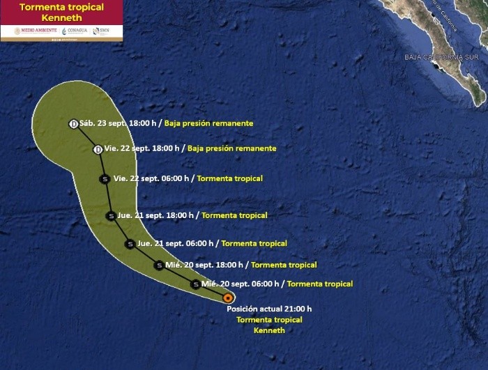 El ciclón se formó el pasado martes y se convirtió en la tormenta número 11 de la temporada de huracanes del Pacifico Norte. Esta mañana Kenneth se ubicaba a mil 600 kilómetros al oeste y suroeste de Cabo San Lucas, Baja California Sur.Con vientos máximos sostenidos de 75 km/h, la tormenta avanzó en dirección norte por el Pacífico mexicano, ante esta trayectoria los meteorólogos han indicado que no se prevé que toque tierra o genere peligro para los habitantes de las costas.El Centro Nacional de Huracanes de Estados Unidos aseguró que la tormenta tropical no durará más de 48 horas por lo que no existe rieso de que se convierta en huracán.Asimismo el Servicio Meteorológico Nacional (SMN) informó que para el viernes 22 su categoría pasará a ser la denominada baja presión y estará ubicado a mil 520 km al oeste-suroeste de Punta Eugenia, Baja California Sur. Sigue su trayectoria en vivo para estr al pendiente de la velocidad y ubicación que tome Kenneth después de hoy.YC