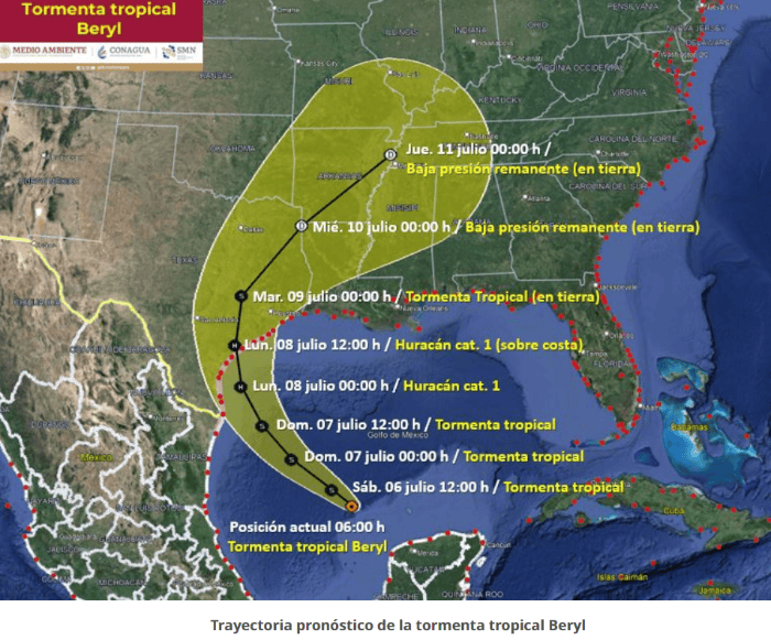 La tormenta tropical "Beryl" mantiene su desplazamiento hacia el oeste-noroeste, se prevé que vuelva a convertirse en huracán en el Golfo de México, pero según el pronóstico del Servicio Meteorológico Nacional (SMN), fuente climática oficial del Gobierno de México; no ingresará por segunda ocasión al territorio nacional.El SMN señaló, que la situación actual, es que el centro de la tormenta tropical "Beryl" mantiene su desplazamiento hacia el oeste-noroeste, sobre el centro del Golfo de México. Sus bandas nubosas ocasionarán lluvias muy fuertes, vientos fuertes y oleaje elevado en estados del litoral del Golfo de México.Durante este fin de semana, la tormenta tropical "Beryl" se intensificará a huracán de categoría 1 sobre el norte del Golfo de México, continuará acercándose a la costa norte de Tamaulipas, previéndose que, durante la madrugada del lunes, "Beryl" impacte entre la costa norte de Tamaulipas y el sur de Texas, EU.Se mantiene zona de vigilancia por efectos de huracán desde Barra el Mezquital, Tamaulipas, hasta la desembocadura de río Grande (frontera México-EU).Según la nueva proyección, "Beryl" se desplazará como tormenta tropical por el Golfo de México y el lunes a medianoche recuperará su categoría como huracán 1, al mediodía, estará sobre la costa y el martes, en tierra, volvería a ser tormenta tropical.* * * Mantente al día con las noticias, únete a nuestro canal de WhatsApp * * *OA