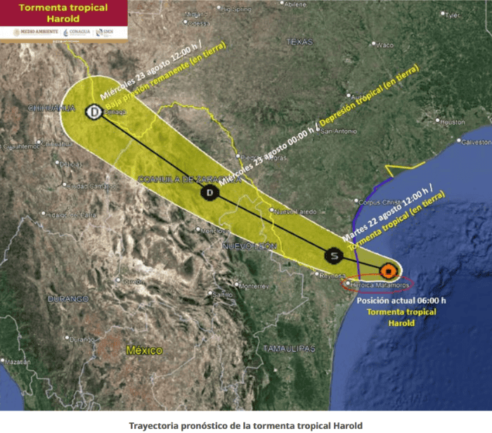 Un nuevo fenómeno natural está afectando a una parte de la República Mexicana, se trata de la tormenta tropical "Harold", que es vigilada de cerca por parte del Servicio Meteorológico Nacional SMN), fuente oficial del Gobierno de México en materia climática.La tormenta tropical "Harold" está muy cerca de la frontera norte de Tamaulipas, informó el SMN a través de un aviso. De continuar con su dirección y velocidad de desplazamiento, se pronostica que el sistema toque tierra en el sureste de Texas, Estados Unidos, entre las 07:00 y 09:00 horas, a 60 km al noreste de la Ciudad de Matamoros, Tamaulipas. En su distancia más cercana de un punto en territorio nacional, "Harold" se localiza a 115 km al este-noreste de la Ciudad de Matamoros, Tamaulipas. Su desplazamiento actual es hacia el oeste-noroeste (285°) a 30 km/h y mantiene vientos sostenidos de 75 km/h y rachas 95 km/h.Su amplia circulación, además de un canal de baja presión en el noreste de México, generan lluvias puntuales torrenciales en Chihuahua, Coahuila, Nuevo León y Tamaulipas, así como lluvias muy fuertes en VeracruzSe espera que impacte y se desplace sobre el sur de Texas, entre las 07:00 y 09:00 horas, y pase aproximadamente a 60 km al noreste de la Ciudad de Matamoros, Tamps., con vientos máximos de 75 km/h, rachas de 95 km/h y desplazamiento rápido hacia el oeste-noroeste como tormenta tropical; a 30 km al sur de Nuevo Laredo, Tamps., como tormenta tropical, con la misma intensidad de los vientos y desplazamiento, ocasionando lluvias torrenciales en los siguientes municipios fronterizos: Nuevo Laredo, Guerrero, Mier, Miguel Alemán, Camargo, Gustavo Díaz Ordaz, Reynosa, Río Bravo y Matamoros, Tamps.; Anáhuac, Lampasos de Naranjo, Parás, Vallecillo, Sabinas Hidalgo, Villaldama y Bustamante, N.L.; Acuña, Zaragoza, Jiménez, Nava, Piedras Negras, Múzquiz, Morelos, Allende, Villa Unión, Guerrero, Hidalgo, Juárez, Sabinas, San Juan de Sabinas, San Buenaventura, Ocampo, Escobedo, Progreso y Sierra Mojada, Coah.De continuar ese desplazamiento, sus remanentes podrían alcanzar los siguientes municipios del noreste de Chihuahua: Manuel Benavides, Camargo, Ojinaga, Coyame del Sotol, Guadalupe, Ahumada, Julimes, Juárez y Aldama.Por otro lado, durante su recorrido por el norte de los estados mencionados, existen condiciones para la formación de torbellinos o tornados, así como trombas marinas en las costas de Tamaulipas. Extremar precauciones a la población en general en las zonas de los estados mencionados por lluvias, viento y oleaje (incluyendo la navegación marítima) y atender las recomendaciones emitidas por las autoridades del Sistema Nacional de Protección Civil, en cada entidad.Con información del Servicio Meteorológico NacionalOA