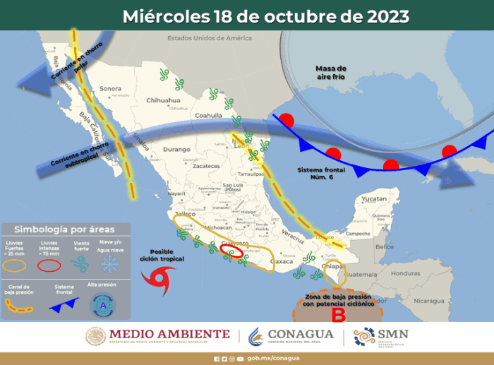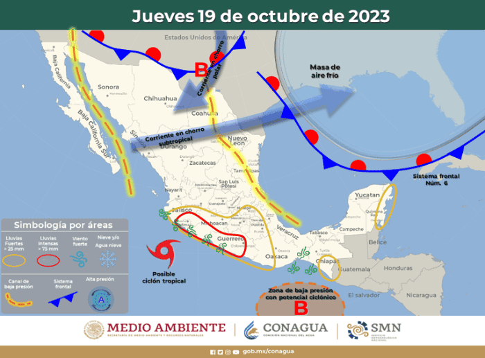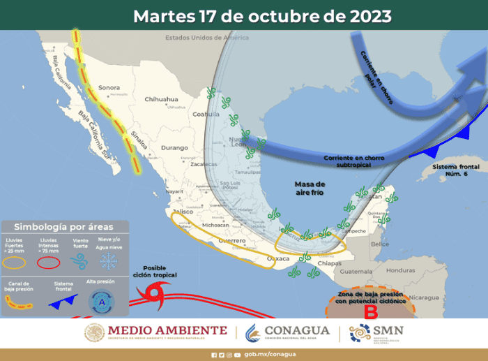 Hay nuevo pronóstico que anticipa lluvias para estados del sur y occidente de México, debido a la aparición de un nuevo ciclón en el Océano Pacífico que, de evolucionar, se convertiría en la tormenta tropical "Norma".Desde el pasado jueves 12 de octubre, el Servicio Meteorológico Nacional (SMN) informaba que vigilaba una zona en el Océano Pacífico con probabilidad de desarrollo ciclónico. Hoy, es casi un hecho que suceda. La tormenta tropical "Norma" está a punto de formarse.La fuente oficial del Gobierno de México en materia climática afirmó que la zona de baja presión con probabilidad de desarrollo ciclónico del Océano Pacífico podría desarrollarse a ciclón tropical al suroeste de las costas de Colima y Michoacán mañana martes 17 de octubre. Sus desprendimientos nubosos favorecerán el ingreso de humedad hacia el occidente y sur del territorio nacional, ocasionando chubascos y lluvias fuertes en ambas regiones.El martes, la zona de baja presión con probabilidad de desarrollo ciclónico del Océano Pacífico podría desarrollarse a ciclón tropical con el nombre de "Norma" al suroeste de las costas de Colima y Michoacán, sus desprendimientos nubosos favorecerán el ingreso de humedad hacia el occidente y sur del territorio nacional, ocasionando chubascos y lluvias fuertes en ambas regiones. Asimismo, se pronostica la formación de un centro de baja presión con probabilidad de desarrollo ciclónico en el Océano Pacífico, frente a las costas de Centroamérica. Lluvias el martes 17 de octubre: El miércoles, el posible ciclón tropical "Norma" se desplazará al suroeste de las costas de Michoacán y Colima, su circulación favorecerá el ingreso de humedad del Océano Pacífico hacia el occidente y sur del territorio nacional, provocando lluvias fuertes a muy fuertes en las mencionadas regiones, previéndose lluvias puntuales intensas en Guerrero. Por su parte, el centro de baja presión con probabilidad de desarrollo ciclónico se desplazará al sur de las costas de Guatemala y Chiapas y se mantendrá en estrecha vigilancia. Lluvias el miércoles 18 de octubre:El jueves, el posible ciclón tropical "Norma" podría aproximarse a las costas de Michoacán, Colima y Jalisco, sus bandas nubosas ocasionarán probabilidad de lluvias intensa a puntuales torrenciales en Guerrero, Michoacán, Colima y Jalisco, así como lluvias fuertes a muy fuertes en la Mesa Central, incluido el Valle de México. Asimismo, el centro de baja presión con probabilidad de desarrollo ciclónico se localizará al sur del Golfo de Tehuantepec y continuará en estrecha vigilancia.Lluvias el jueves 19 de octubre:Lluvias intensas con puntuales torrenciales (150 a 250 mm): Guerrero. Lluvias muy fuertes con puntuales intensas (75 a 150 mm): Jalisco, Colima y Michoacán. Lluvias fuertes con puntuales muy fuertes (50 a 75 mm): Estado de México, Oaxaca y Chiapas.* * * Mantente al día con las noticias, únete a nuestro canal de Whatsapp * * *Con información Servicio Meteorológico NacionalOA