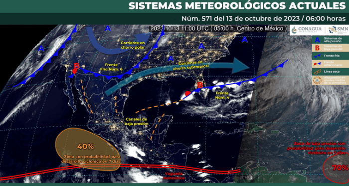 Ayer, el Servicio Meteorológico Nacional (SMN), fuente climática oficial del Gobierno de México, informaba de una zona vigilada en el Océano Pacífico por su posibilidad de desarrollo ciclónico que, de continuar su evolución, eventualmente daría forma a la tormenta tropical "Norma", ¿Cómo ha evolucionado este viernes 13 de octubre?Este día, el SMN informa sobre este mismo fenómeno natural y señala:"Se prevé la formación de una zona de baja presión al sur de las costas de Michoacán, Guerrero y Oaxaca. Mantiene 40% de probabilidad para desarrollo ciclónico en 7 días".Por lo que, de ayer a hoy, incrementó su probabilidad en 10 por ciento.Lo importante de este fenómeno natural es que, de continuar su evolución, se podría desarrollar un nuevo ciclón tropical que llevaría el nombre de "Norma"."Norma" es el siguiente ciclón tropical de la temporada 2023 que se desarrollaría en el Pacífico, de una estimación de entre 16 y 22.Hasta ahora, han existido 5 tormentas tropicales, 2 huracanes con categoría 1 ó 2, y 6 huracanes categorías 3, 4 ó 5; siendo el mayor con categoría 4 "Lidia", que impactó en las costas de Jalisco y Nayarit, y que además de los daños materiales que ocasionó, dejó 2 víctimas mortales, una en cada estado.Con información Servicio Meteorológico NacionalOA