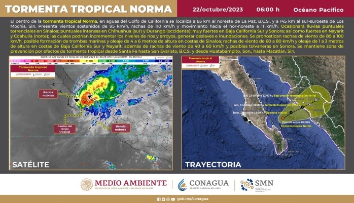El Servicio Meteorológico Nacional informa que el centro de la tormenta tropical "Norma" se localiza en aguas del Golfo de California y se mantiene con rumbo hacia el norte de Sinaloa.El fenómeno provocará lluvias puntuales torrenciales en Sinaloa; puntuales intensas en Chihuahua y Durango; muy fuertes en Baja California Sur y Sonora; así como fuertes en Nayarit y Coahuila; las cuales podrían incrementar los niveles de ríos y arroyos, generar deslaves e inundaciones.Se pronostican rachas de viento de 80 a 100 km/h, posible formación de trombas marinas y oleaje de 4 a 6 metros de altura en costas de Sinaloa; rachas de viento de 60 a 80 km/h y oleaje de 1 a 3 metros de altura en costas de Baja California Sur y Nayarit; además de rachas de viento de 40 a 60 km/h y posibles tolvaneras en Sonora.Se pide a la población extremar precauciones en las zonas de los estados mencionados por lluvias, viento y oleaje (incluida la navegación marítima) y atender las recomendaciones emitidas por las autoridades del Sistema Nacional de Protección Civil, en cada entidad.La tarde de este sábado"Norma"se degradó a tormenta tropical, luego de impactar como huracán categoría 1 a Baja California.