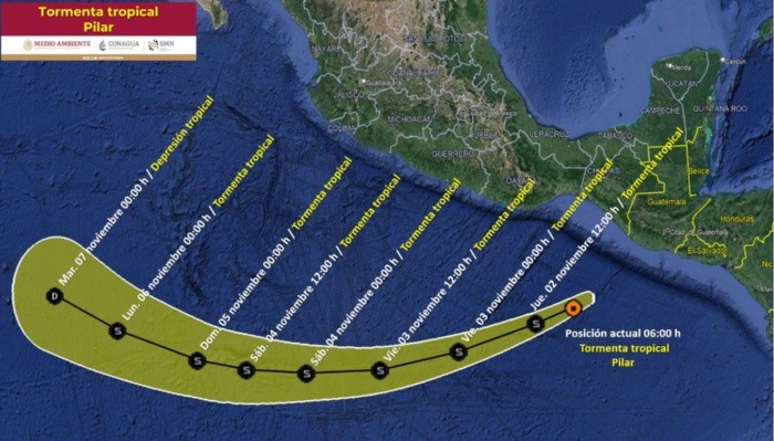 La tormenta tropical "Pilar" continúa su evolución en el Océano Pacífico, al sur de país, y se localiza cerca de Chiapas, informó esta mañana el Servicio Meteorológico Nacional (SMN), fuente climática oficial del Gobierno de México.El SMN señaló que la tormenta tropical "Pilar" se localiza al sur de Chiapas y su amplia circulación en interacción con la masa de aire frío de origen ártico que impulsó al frente frío Núm. 8, localizado sobre el occidente del Mar Caribe, ocasionarán lluvias puntuales intensas en Veracruz, Tabasco y Chiapas.El sistema se encuentra a 395 km al suroeste de la desembocadura del Río Suchiate (frontera entre México y Guatemala) y a 450 km al sur-sureste de Puerto Ángel, Oaxaca.Su amplia circulación interacciona con la masa de aire frío de origen ártico que impulsó al frente frío Núm. 8, localizado sobre el occidente del Mar Caribe, ocasionarán lluvias puntuales intensas en Veracruz, Tabasco y Chiapas y lluvias puntuales muy fuertes en Oaxaca.Se pronostican rachas de viento de 80 a 100 km/h en el Istmo de Tehuantepec y oleaje de 2 a 4 metros de altura en el Golfo de Tehuantepec.Piden extremar precauciones a la población en general en las zonas de los estados mencionados por lluvias, viento y oleaje (incluyendo la navegación marítima) y atender las recomendaciones emitidas por las autoridades del Sistema Nacional de Protección Civil, en cada entidad.Con información del Servicio Meteorológico Nacional* * * Mantente al día con las noticias, únete a nuestro canal de WhatsApp * * *OA