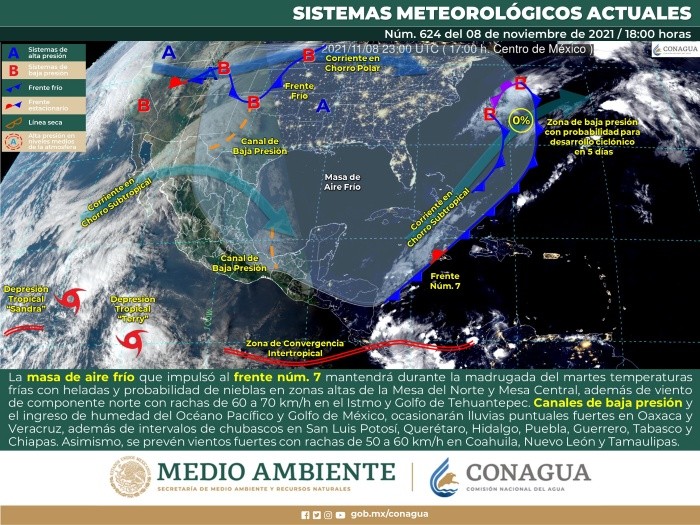 Las tormentas tropicales "Sandra" y "Terry" se degradaron esta tarde a categoría de depresión tropical en aguas del Pacífico, informó el Servicio Meteorológico Nacional (SMN)."Sandra" y "Terry" se ubican muy lejos de costas mexicanas, por lo que no representan un peligor para el país, detalló el SMN.A las 15:00 horas, "Sandra" se ubicaba a mil 145 klómetros al suroeste de Cabo San Lucas, Baja California Sur, mientras que "Terry" se localizaba a 995 kilómetros al sur-suroeste de Punta San Telmo, Michoacán, y a mil 395 km al sur de Cabo San Lucas.Por otra parte, el SMN indicó que la masa de aire frío asociada al frente número 7 cambiará sus características, por lo que se espera un gradual ascenso de las temperaturas en el noreste, oriente y sureste de México.Sin embargo, pronostica que durante la madrugada del martes persistirán temperaturas frías con heladas sobre entidades de la Mesa del Norte y Mesa Central, además de viento de componente norte con rachas de 60 a 70 km/h en el Istmo y Golfo de Tehuantepec, condición que disminuirá gradualmente.La temperaturas mínimas en la madrugada del martes serán de -5 a 0 °C con heladas en zonas montañosas de Chihuahua, Durango, Estado de México, Tlaxcala y Puebla.IM