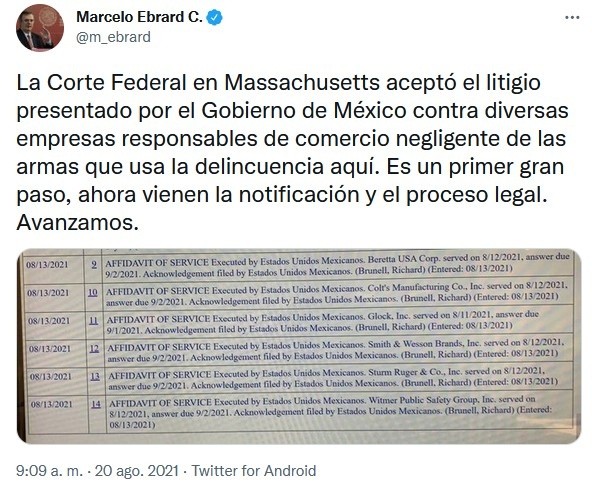 Una corte federal en Estados Unidos admitió la histórica demanda del Gobierno de México contra empresas de armas estadounidense por tráfico ilegal, informó este viernes el secretario de Relaciones Exteriores, Marcelo Ebrard."La Corte Federal en Massachusetts aceptó el litigio presentado por el Gobierno de México contra diversas empresas responsables de comercio negligente de las armas que usa la delincuencia aquí", anunció el canciller mexicano en redes sociales.En el mismo mensaje, Erard lo calificó de "un primer gran paso" y detalló que "ahora vienen la notificación y el proceso legal".La Secretaría de Relaciones Exteriores (SRE) anunció el pasado 4 de agosto una histórica demanda contra una decena de empresas armamentísticas de Estados Unidos a las que acusa de llevar a cabo prácticas negligentes que facilitan el tráfico de armas y la violencia en México.Esta demanda, cuyo recorrido se puede alargar varios años, se interpuso ante una corte federal en Boston (Massachusetts), sede de dichas compañías, en contra de las empresas y no del Gobierno estadounidense.Con ello, las autoridades mexicanas buscan que aumente el control sobre las armas en Estados Unidos, pero también exigen una compensación económica, cuya cantidad todavía no han calculado.El Gobierno mexicano estima que más de medio millón de armas se trafican cada año de Estados Unidos a México y son responsables de 17 mil homicidios anuales, con un costo de entre el 1.5% y el 2% del producto interno bruto (PIB) mexicano.México comenzó a preparar esta demanda hace dos años, tras la matanza contra latinos perpetrada por Patrick Crusius el 3 de agosto de 2019 en la fronteriza ciudad de El Paso (Texas), donde murieron 23 personas, de las cuales 9 eran mexicanas. Si te interesó esta noticia y quieres saber más, entonces descarga y descubre INFORMAPlus, la aplicación digital de EL INFORMADOR, en donde tenemos contenidos exclusivos, seleccionados por nuestros editores, para darles una experiencia más completa a los lectores. Descarga la aplicación y pruébala GRATIS por treinta días. Para iOS: https://apple.co/35jaVgbPara Android: https://bit.ly/3gwVSEVSi eres suscriptor de EL INFORMADOR tu acceso está incluido, solicítalo al 33 3678-7777IM