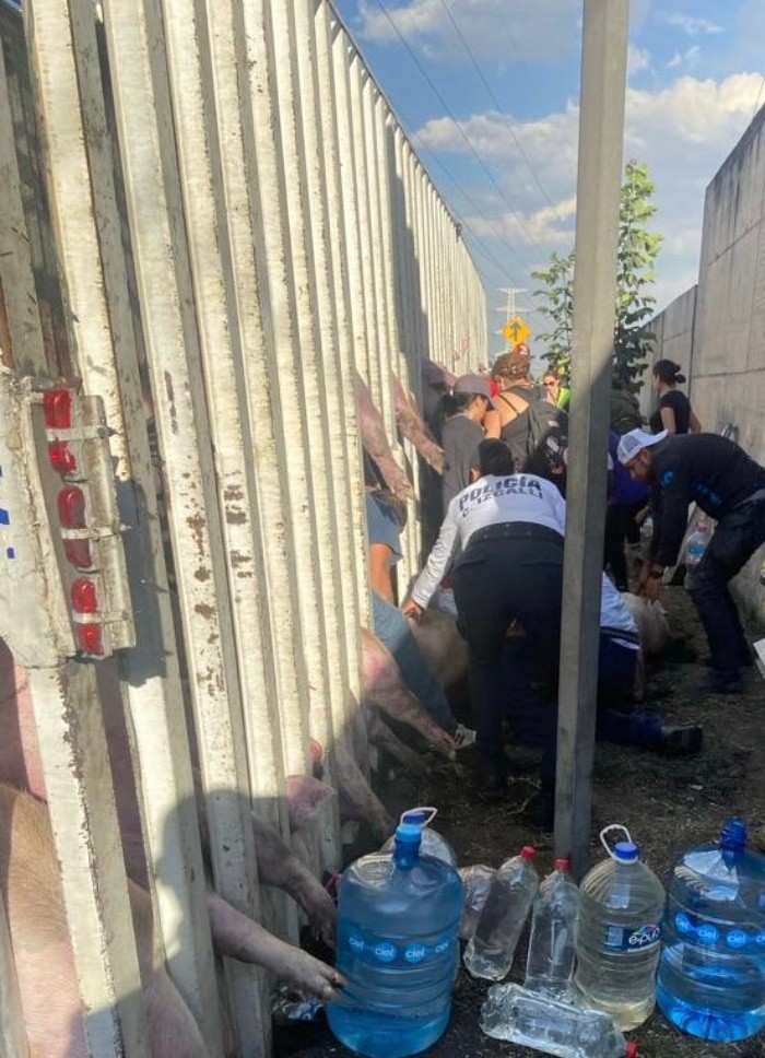 Un tráiler que transportaba cerdos se volcó la mañana de este viernes dos de febrero en el Circuito Exterior Mexiquense, en el municipio de Cuautitlán Izcalli.De acuerdo a los primeros reportes, el tráiler circulaba a gran velocidad, lo que sumado con la gran carga de los cerditos provocó que éste perdiera el control y se volcara.Debido al accidente, varios de los cerdos transportados murieron aplastados y otros terminaron atrapados entre los barrotes de las jaulas.Tras casi siete horas desde el accidente, elementos de la Coordinación de Protección Civil y Bomberos lograron comenzar a sacar algunos de los animales atrapados, sin embargo, debido a que varios de los cerditos resultaron lesionados, tendrán que ser sacrificados. Hasta el momento se desconoce el número de cerdos muertos, informó el Gobierno Municipal de Cuautitlán Izcalli. A través de redes sociales se compartió un video donde se puede ver que, antes de la llegada de las autoridades al lugar, diversas personas se acercaron al tráiler para dar alimento y agua a los animales, mismas que fueron voluntarias para poder rescatar a los cerditos, pues debido a que es necesarios serruchar los tubos de las jaulas se ha prolongado el rescate.Finalmente, respecto al conductor del vehículo fue atendido por los servicios de emergencia, pues resultó con heridas menores y fue puesto a disposición del Ministerio Público. NA