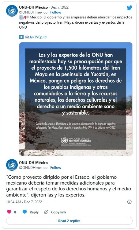 El gobierno mexicano debe tomar medidas adicionales para garantizar el respeto de los derechos humanos y el medio ambiente, señalaron expertos de la Organización de las Naciones Unidas (ONU) al externar su preocupación por que el proyecto de mil 500 kilómetros del Tren Maya en la península de Yucatán, en México, podría poner en peligro los derechos de los pueblos indígenas, los recursos naturales, los derechos culturales y el derecho a un medio ambiente sano y sostenible.A través de un comunicado, expresaron que las personas defensoras de los derechos humanos que plantean sus preocupaciones sobre los impactos negativos se enfrentan a amenazas y ataques y a un acceso seguro muy limitado a un tribunal independiente e imparcial.Las y los expertos de la ONU indicaron que el gobierno ha elevado el proyecto a la categoría de proyecto de seguridad nacional, lo que le permite derogar la aplicación de las salvaguardias ambientales y sociales."Este cambio de estatus del proyecto dirigido por el Estado no permite a México eludir su obligación internacional de respetar, proteger y cumplir los derechos humanos de las personas afectadas por este megaproyecto y de proteger el medio ambiente de acuerdo con las normas internacionales", argumentaron."Esta decisión no sólo tiene el potencial de permitir que los abusos de los derechos humanos sigan sin ser abordados, sino que también socava el propósito del proyecto de llevar un desarrollo social y económico inclusivo y sostenible a los cinco estados mexicanos involucrados. En este contexto, la creciente participación del ejército en la construcción y gestión del proyecto también suscita gran preocupación", afirmó Fernanda Hopenhaym, presidenta del Grupo de Trabajo de la ONU sobre Empresas y Derechos Humanos.Pidieron al gobierno que garantice la participación significativa de las comunidades afectadas y la transparencia en las evaluaciones de los derechos humanos y del impacto ambiental antes de cualquier decisión futura relacionada con el proyecto, como elementos clave para identificar, prevenir y abordar cualquier otro impacto negativo."Debe respetarse el consentimiento libre, previo e informado de los pueblos indígenas y deben evaluarse de forma transparente los impactos acumulativos reales y potenciales de los proyectos, de acuerdo con las normas internacionales de derechos humanos y medioambientales", dijeron los expertos.Las y los expertos también expresaron su preocupación por la falta de debida diligencia en materia de derechos humanos por parte de las empresas implicadas en el proyecto, cuyo coste se estima en 20 mil millones de dólares."Las empresas e inversores relevantes domiciliados en España, Estados Unidos y China no pueden hacer la vista gorda ante los graves problemas de derechos humanos relacionados con el proyecto del Tren Maya", dijeron.JM