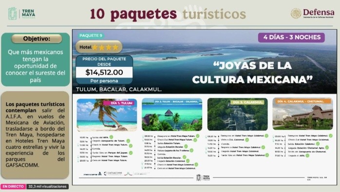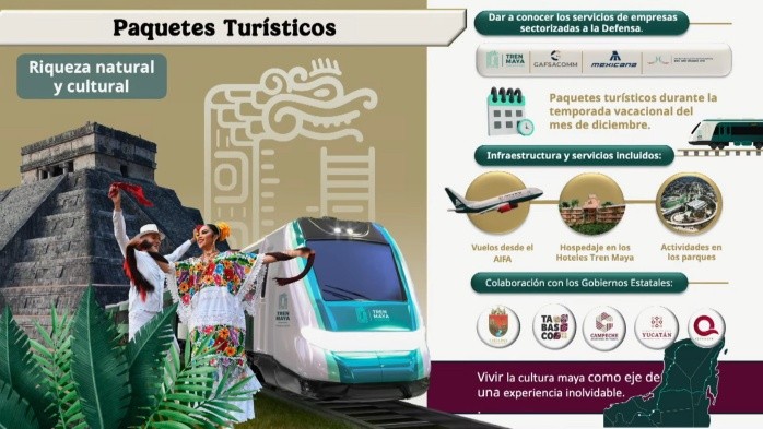 En el marco de las vacaciones decembrinas, el Tren Maya lanzó paquetes turísticos desde 8 mil 916 pesos por persona, que incluyen vuelos desde y hacia el Aeropuerto Internacional Felipe Ángeles (AIFA), visitas a zonas arqueológicas, playas, y con vuelos de Mexicana de Aviación, para "vivir la experiencia maya como eje de una experiencia turística inolvidable".El general Óscar David Lozano Águila, director del Tren Maya, destacó "la gran idea" de la presidenta Claudia Sheinbaum Pardo, en colaboración con Chiapas, Tabasco, Campeche, Yucatán y Quintana Roo, estados por donde pasa el Tren Maya."Pretendemos acercar servicios turísticos, precisamente para la temporada vacacional de diciembre, e hicimos un esfuerzo para que las empresas sectorizadas a la Secretaría de la Defensa Nacional, que son el Tren Maya, el Gafsacomm, Mexicana de Aviación y el Aeropuerto Internacional Felipe Ángeles. Podamos ofrecer estos paquetes y la infraestructura y servicios que nosotros administramos", destacó el general Lozano Águila.Los paquetes, describió, incluyen salir y llegar al AIFA, "que además es uno de los más bonitos del mundo". También flexibilidad de horarios y fechas, traslados en el Tren, con una tarifa nacional de 50% de descuento, y hospedaje en los hoteles de cuatro estrellas cercanos a las zonas arqueológicas."Les garantizamos que estamos ofreciendo el precio más barato con relación con la oferta turística nacional (...) Podemos armonizar los servicios que estamos brindando las empresas, y estamos tratando de atraer al turismo nacional a conocer al sureste", dijo al hacer una invitación para que conviertan al sureste de México en su destino."De verdad es una oportunidad única, creemos que ha sido una gran idea de nuestra Presidenta, mi general secretario (Ricardo Trevilla) para poder acercar esos servicios a más mexicanos", apuntó el director del Tren Maya.FS