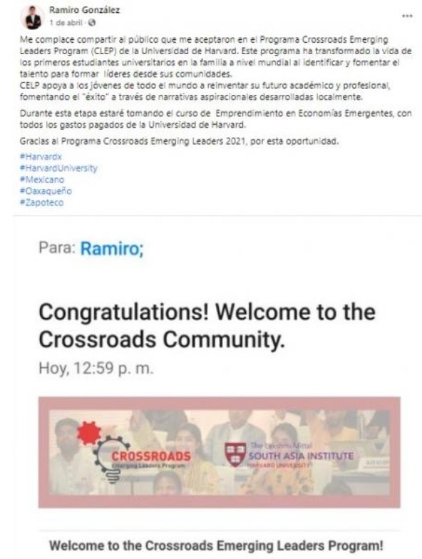 Ramiro González Cruz, un joven originario de San Isidro El Costoche, comunidad ubicada en la Sierra Sur de Oaxaca, fue becado por la Universidad de Harvard a través del Programa Encrucijada de Líderes Emergentes 2021.El proyecto de este joven zapoteco de 23 años está orientado en apoyar a otros emprendedores que no cuentan con registro de una marca, ni imagen, pero que están interesados en exportar sus productos a otros países.Ramiro González compartió la noticia a través de un mensaje en sus redes sociales: "Me complace compartir al público que me aceptaron en el Programa Crossroads Emerging Leaders Program (CLEP) de la Universidad de Harvard", el joven explicó que "este programa ha transformado la vida de los primeros estudiantes universitarios en la familia a nivel mundial al identificar y fomentar el talento para formar líderes desde sus comunidades".La Universidad Tecnológica de los Valles Centrales de Oaxaca, donde se graduó como técnico superior en Desarrollo de Negocios y después cursó la Licenciatura en Innovación en Negocios y Mercadotecnia, se unió a las felicitaciones. "La #ComunidadUTVCO felicita a Ramiro González Cruz por este importante logro que sin duda contribuirá a su desarrollo personal y profesional", mencionó en sus redes sociales.Ramiro es el primer profesionista de San Isidro El Costoche, su pequeña comunidad que cuenta con menos de 400 habitantes, donde se habla la lengua zapoteca.JM