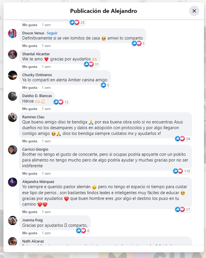 Dos perritos callejeros, un macho y una hembra que circulaban por la pista de Texcoco-Américas del Estado de México, se hicieron virales tras descubrir que la hembra era ciega y que su acompañante le ayudaba a moverse previniendo que esta se desviara a los carriles centrales y provocara un accidente.Ambas criaturas parecen ser de la raza de Pastor Alemán y se desconoce si previamente tenían dueño, pero se identifica, por la suciedad de su pelaje, que han pasado desde hace mucho circundando por las calles.El hecho fue difundido por el usuario de Facebook Alejandro A. Martínez, quien parece ser instructor canino, y al mismo tiempo los auxilió en cuanto descubrió la condición de la perrita. Incapaz de abandonarlos a su suerte se dio a la tarea de subirlos a su vehículo particular y difundir su caso hasta encontrarles un nuevo hogar.Los comentarios en redes sociales emergieron enfatizando la tristeza y la felicidad de saber que por el momento se encuentran en buenas manos y muchos ayudaron a difundir el caso para encontrarles un nuevo hogar. De acuerdo con las publicaciones de Alejandro Martínez, a ambos perros se les veía exhaustos, sobre todo al macho por cuidar a su compañera, y descansaron en su domicilio, pero debido al apoyo de los amantes de los animales a la mañana siguiente ya habían encontrado una familia de acogida, por lo que a ambos canes les llegaría un final feliz.“Banda ya hay alguien que los va a cuidar, ya se fueron al veterinario y a la estética. Van a estar en buenas manos”, anunció Alejandro A. Martínez. AH