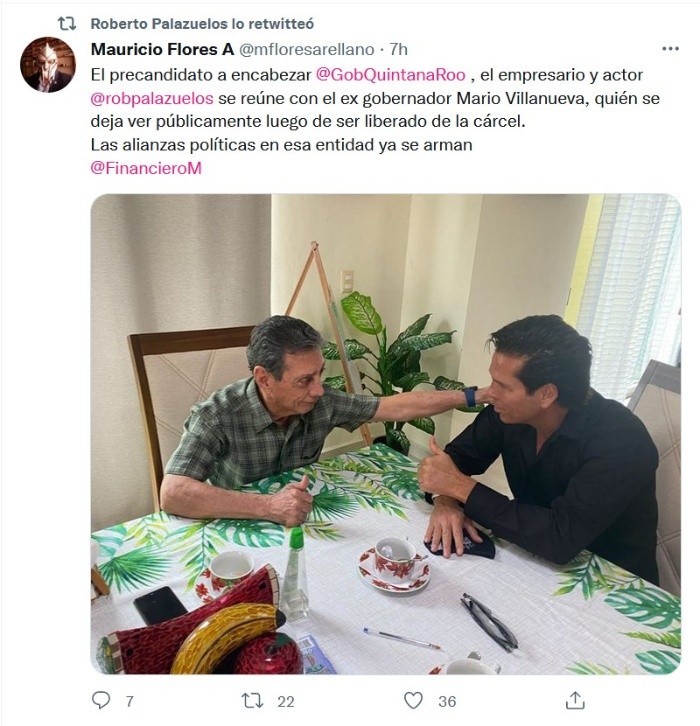 El actor y empresario Roberto Palazuelos, conocido también como el "diamante negro", apareció este viernes en una imagen junto con el exgobernador de Quintana Roo, Mario Villanueva.Palazuelos ha externado en diversas ocasiones sus ambiciones de postularse para la candidatura al gobierno de Quintana Roo, estado en el que ha vivido 23 años.Villanueva Madrid se encuentra en prisión domiciliaria debido a su edad y múltiples afectaciones a su salud. El exmandatario estuvo preso por lavado de dinero y asociación delictuosa.Palazuelos ha sostenido reuniones que ha hecho públicas con políticos, una de ellas fue el año pasado con dirigente nacional del PRD, Jesús Zambrano, y el coordinador del partido en la Cámara de Diputados, Luis Cházaro.JM