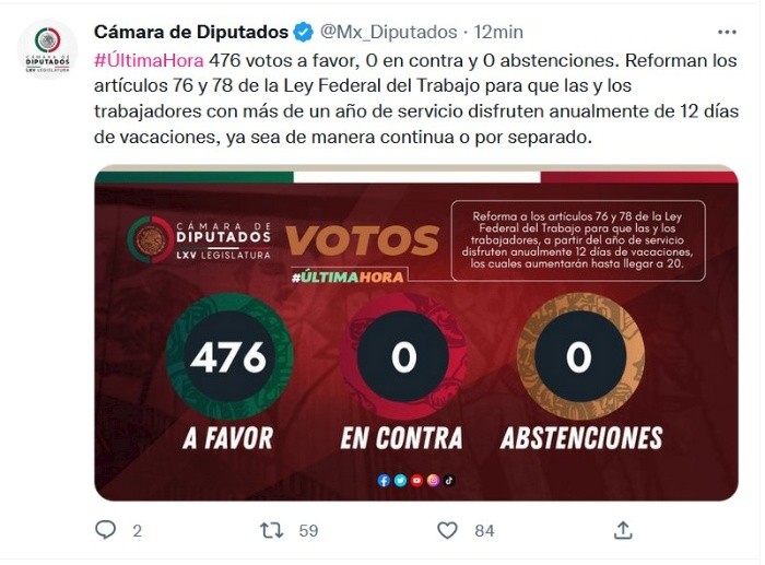 La reforma a la Ley Federal del Trabajo fue avalada la noche de este jueves por 476 votos a favor y deberá volver al Senado de la República debido a que sufrió modificaciones.La minuta original, recibida de la Cámara de Senadores, ya establecía los 12 días continuos, sin embargo, la Comisión del Trabajo la modificó para establecer que serían seis días de corrido y los seis restantes deberían ser negociados con el patrón.Lo anterior generó un sinnúmero de inconformidades, incluso de diputados de Morena y de sus aliados, motivo por el que se interpuso una adenda para devolver los 12 días seguidos.La diputada guinda, Susana Prieto, fue una de las principales opositoras a la modificación, y durante el debate, confesó que se “aferró” a que la propuesta original fuera devuelta.“Que bueno que me aferré, lo logramos, más de 50 años tardamos en pagar esta deuda. El problema no eran los seis días, sino los abusivos de los patrones quienes diluyeron esos días al decir “¿tienes necesidad de llevar a tu hijo al Seguro Social? Fírmame aquí y te doy un día de vacaciones”, “¿te mandaron a llamar en la escuela de tu hijo? Fírmame aquí, te doy otro día”, y así, llegados los seis días, ese trabajador que es la fuente de la riqueza de este país y de todos los países del mundo, no podía disponer de un solo día de vacaciones”Manuel de Jesús Baldenebro, Presidente de la Comisión de Trabajo y Previsión Social, reconoció que tener seis días de descanso al año representa un periodo insuficiente con la realidad actual, “pues el mundo del trabajo ha representado varios cambios”.“Ampliar este periodo se traduce en un avance al reconocimiento de los derechos que deben gozar todas las personas trabajadoras. Hoy las personas trabajadoras que tengan más de un año de servicio disfrutarán de un periodo de vacaciones pagadas que en ningún caso podrá ser inferior a 12 días”, puntualizó."Se incluye la potestad para que el trabajador habrá de decidir el tiempo y la forma en que habrá de disfrutar su periodo vacacional conforme a sus necesidades. Con esta reforma estamos mejorando el desempeño laboral de los trabajadores y trabajadoras de este país, así como la productividad y el buen funcionamiento de los centros de trabajo”.Sergio Barrera, de Movimiento Ciudadano, y promotor de la iniciativa, celebró que la reforma sea una realidad.“Será una realidad para más de 20 millones de trabajadoras y trabajadores. Hoy es un gran día para México, hoy saldamos la deuda histórica con los trabajadores de este país”, destacó.En tanto, Marco Antonio Natale, del PVEM explicó que “con esta adenda se atienden las inquietudes expresadas por algunos sectores”: “Incrementar los días abonarán a la salud y al bienestar de los empleados, mientras que representa también un beneficio para las empresas en términos de productividad”.La reforma establece que las personas trabajadoras deberán disfrutar en forma continua de 12 días de vacaciones, por lo menos, que aumentarán en dos días laborales hasta llegar a veinte por cada año subsecuente de servicios; y, que, a partir del sexto año, el periodo de vacaciones aumentará en dos días por cada cinco de servicios hasta llegar a 32.Asimismo, las personas trabajadoras tendrán la potestad y el derecho de convenir con el patrón la forma y tiempos en el que disfrutarán los días de vacaciones que tengan a su favor, ya sea de forma continua o parcial.Las disposiciones transitorias establecen que el decreto entrará en vigor el 1 de enero de 2023 o al día siguiente de su publicación, si ésta fuera en el 2023.JM