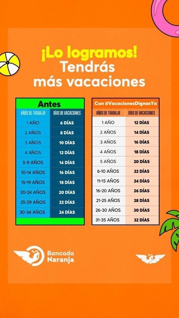 Recordó que la reforma amplía el periodo de vacaciones, por lo que pasarán de seis a 12 días de descanso en el primer año laboral. “Y cada día se irán añadiendo días hasta llegar a 20”.