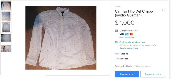 Tras el operativo fallido del Gobierno federal por detener a Ovidio Guzmán López, hijo de Joaquín "El Chapo" Guzmán, el pasado jueves en Culiacán, Sinaloa, en portales de venta por Internet se han comenzado a vender camisas y escapularios similares a los que aparece en la fotografía que, presuntamente, ese día le tomaron elementos federales.En un sitio web, un comerciante radicado en Celaya, Guanajuato, vende por mil pesos una camisa similar a la que el llamado "El Ratón" portó el pasado jueves.Al describir la camisa, el vendedor detalla que "tiene un pequeño punto rojo en la parte de atrás del cuello (en verdad no se alcanza a ver) está en las fotos. Es de 'Cuidado con el perro', única playera".En tanto que por 19 dólares (380 pesos), una persona en Nuevo León, vende escapularios similares a las que portó Guzmán López hace cuatro días."¿Vendes los dos escapularios? ¿Incluyen la cadena y el listón para usarlos?", son algunas de las preguntas que han hecho al vendedor virtual.JM