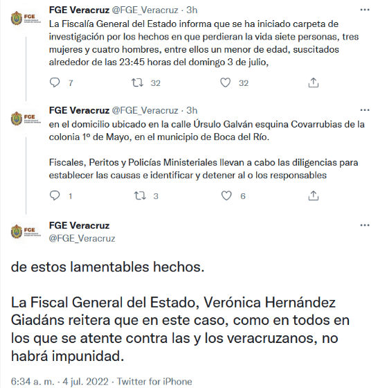 Siete personas, integrantes de una misma familia, fueron asesinados dentro de su domicilio ubicado en el municipio de Boca del Río, en Veracruz, informó la Fiscalía del Estado. Las víctimas son tres mujeres y cuatro hombres, entre ellos un menor de edad. La dependencia detalló que el atentado ocurrió la noche de ayer domingo, a las 23:45 horas, en un domicilio ubicado en la colonia 1 de Mayo, cerca de la zona del cuartel militar de La Boticaria. Según reportó RadioFórmula, hombres armados ingresaron a la vivienda y acribillaron a las personas que estaban dentro. En el lugar ya no hay elementos policiales, pero la casa está acordonada. Por su parte, la Fiscalía aseguró que "Peritos y Policías Ministeriales llevan a cabo las diligencias para establecer las causas e identificar y detener al o los responsables"."La Fiscal General del Estado, Verónica Hernández Giadáns reitera que en este caso, como en todos en los que se atente contra las y los veracruzanos, no habrá impunidad", finalizaron.