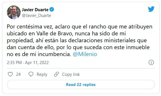 Javier Duarte, exgobernador de Veracruz preso en el Reclusorio Norte, negó "por centésima vez" que sea dueño de un rancho ubicado en Valle de Bravo, Estado de México.A través de una cuenta de Twitter, Duarte aclaró que el rancho nunca ha sido de su propiedad, luego de que medios señalaron que un supuesto "prestanombres" busca recuperarlo."Por centésima vez, aclaró que el rancho que me atribuyen ubicado en Valle de Bravo, nunca ha sido de mi propiedad, ahí están las declaraciones ministeriales que dan cuenta de ello, por lo que suceda con este inmueble no es de mi incumbencia", escribió Duarte.En marzo de 2021, el Gobierno de Veracruz anunció que donaría a la Secretaría de la Defensa Nacional (Sedena) el 66 por ciento del lujoso rancho Las Mesas que le fue incautado al exgobernador Javier Duarte de Ochoa.El gobernador del estado, el morenista Cuitláhuac García Jiménez, solicitó al Congreso autorización para enajenar a título gratuito parte del rancho ubicado en Las Mesas, municipio de Valle de Bravo, en el Estado de México.JM