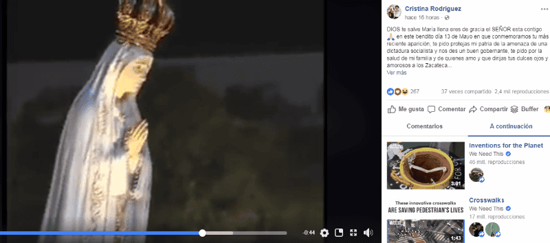 A través de Facebook, la primera dama de Zacatecas, Cristina Rodríguez, pidió a la Virgen de Fátima que salve a México de convertirse en una dictadura socialista.En una publicación, la esposa del gobernador priista Alejandro Tello escribió parte de una oración con la que pidió a la virgen proteger “mi patria de la amenaza de una dictadura socialista”, haciendo referencia a los comentarios realizados por candidatos presidenciales y spots del PRI y el PAN sobre López Obrador, a quien han comparado con el expresidente de Venezuela, Hugo Chávez.La publicación en Facebook - realizada en conmemoración de la “más reciente aparición” de la Virgen - ha sido compartida 35 veces y tiene 267 reacciones hasta el momento.Rodríguez, quien se desempeña como presidenta del DIF en el estado, también pidió a Dios que “nos des un buen gobernante… y que dirijas tus dulces ojos y amorosos a los zacatecanos para que en nosotros germine y viva el amor de Cristo tu divino hijo. Amén” (sic).Verificado 2018 confirmó a través del área de comunicación social de Zacatecas que la página de Facebook en la que se difundió la publicación sí es la cuenta personal de Cristina Rodríguez, que es manejada por la propia titular.En junio de 2017, la primera dama fue criticada por decir que un grupo de jóvenes que montaron una coreografía vestidos con pantalones de estampado militar, pasamontañas y gafas, parecían “sicarios” y promovían ese “ejemplo para la sociedad”.Durante el periodo de precampañas y campañas, el PRI y el PAN han difundido diversos anuncios en los que comparan al candidato de la coalición Juntos Haremos Historia, Andrés Manuel López Obrador, con el expresidente venezolano Hugo Chávez, y lo califican como “un peligro” para el país.