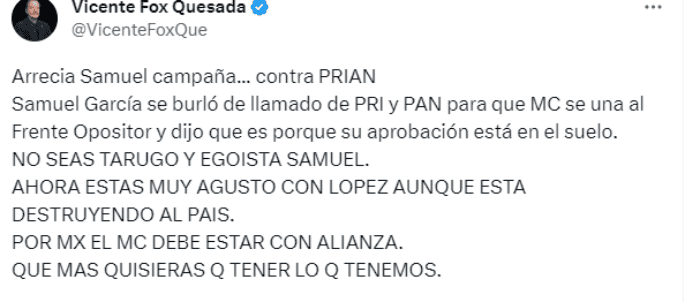 El expresidente panista Vicente Fox Quesada habló este sábado del gobernador de Nuevo León, Samuel García para hacerle un llamado a unirse al frente opositor de Morena.Por medio de un tuit, el fundador de Centro Fox se quejó de la burla que el representante de Movimiento Ciudadano hizo al respecto de la propuesta del PRIAN hacia su partido para unirse el Frente Opositor y lo llamó egoísta por ignorar la oferta."No seas tarugo y egoísta Samuel. Ahora estás muy a gusto con López, aunque está destruyendo al país. por MX el MC debe estar con alianza. Que más quisieras que tener lo que tenemos", fue parte del mensaje que el exmandatario dirigió a Samuel, haciendo referencia a que MC se encuentra supuestamente aliado a la autonombrada Cuarta Transformación.El viernes, el gobernador de Nuevo León Samuel García Sepúlveda rechazó que MC haga alianza con el PRI y el PAN, bajo el argumento de que ambos partidos integrantes del Frente Amplio Opositor buscan sumar al partido naranja a su frente por interés, ya que está bien posicionado, mientras ellos "están en el suelo, y más que eso, tres pies abajo".Agregó que ambos partidos piden a líderes de MC que hablen con Dante Delgado y con Samuel García, para que acepten una alianza, porque "se nos cae el país" y que "por favor sean prudentes".Sin embargo, reiteró su rechazo a una alianza con el PRI y el PAN pues afirmó que en 40 años dichos partidos nada hicieron por el estado, y les da el "patatús" porque a su gobierno le está yendo bien, y por eso se la pasan poniendo obstáculos a su administración.FS