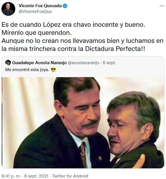 El fundador del PRD y exdiputado federal, Guadalupe Acosta Naranjo, publicó en redes sociales una fotografía en la que aparece el exmandatario Vicente Fox abrazado del Presidente Andrés Manuel López Obrador (AMLO).Tras la publicación de la "joya", el expresidente Vicente Fox mencionó que la imagen es de "cuando López era chavo, inocente y bueno"."Aunque no lo crean, nos llevábamos bien y luchamos en la misma trinchera contra la Dictadura Perfecta!!", escribió el exmandatario de México. "Mírenlo que querendón", reaccionó a la imagen.El 9 de agosto pasado, luego de que el exmandatario Vicente Fox informó que dio positivo a COVID-19 junto a su esposa Marta Sahagún, el Presidente López Obrador le deseó recuperación."Deseo que le vaya muy bien, que se recupere, que se alivie el presidente Fox y su esposa", dijo López Obrador en su conferencia mañanera en Ciudad Juárez, Chihuahua.Al respecto, Vicente Fox, quien decidió internarse con Marta Sahagún en un hospital, agradeció a López Obrador por el "bonito saludo"."Gracias, muchas gracias López por tu bonito saludo. Muy apreciado!! Saludos a la familia! México somos uno y somos todos. Pronto saldremos de esta", escribió el exmandatario.Si te interesó esta noticia y quieres saber más, entonces descarga y descubre INFORMAPlus, la aplicación digital de EL INFORMADOR, en donde tenemos contenidos exclusivos, seleccionados por nuestros editores, para darles una experiencia más completa a los lectores.Descarga la aplicación y pruébala GRATIS por treinta días.Para iOS: https://apple.co/35jaVgb Para Android: https://bit.ly/3gwVSEVSi eres suscriptor de EL INFORMADOR tu acceso está incluido, solicítalo al 33 3678-7777OA