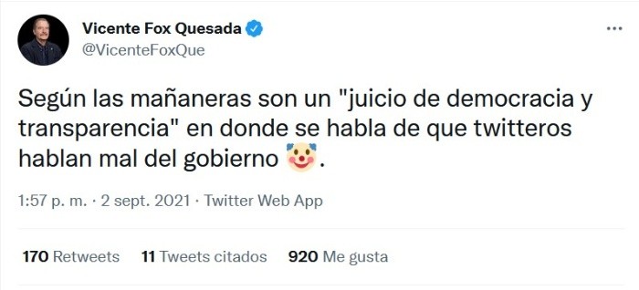 Elizabeth García Vilchis, encargada de la sección "quién es quién en las mentiras de la semana" de la mañanera del Presidente Andrés Manuel López Obrador (AMLO), señaló que el exmandatario Vicente Fox difundió una noticia falsa en redes sociales "con tal de pegarle al gobierno del Presidente López Obrador"."Queremos mostrar material en el que un personaje de la vida pública reproduce una noticia falsa y la comenta como si fuera verdadera", dijo García Vilchis al exhibir un mensaje de Fox del 18 de agosto pasado en el que el expresidente refirió "que miles de españoles abarrotan embajadas y puestos fronterizos porque supuestamente querían huir de su país ante la tentativa del gobierno mexicano de invadir la península Ibérica e imponer a López Obrador como su monarca"."La mentira es obvia, pero personajes como Fox no escatiman la oportunidad para golpear al gobierno, incluso aunque se trate de mentiras tan burdas. Esa nota fue clasificada como falsa por un sitio de verificación de información, pero el señor Fox ni por enterado", agregó.Al respecto, Vicente Fox respondió en redes sociales con el "emoji" de un payaso. "Según las mañaneras son un 'juicio de democracia y transparencia' en donde se habla de que twitteros hablan mal del gobierno", escribió.Si te interesó esta noticia y quieres saber más, entonces descarga y descubre INFORMAPlus, la aplicación digital de EL INFORMADOR, en donde tenemos contenidos exclusivos, seleccionados por nuestros editores, para darles una experiencia más completa a los lectores. Si eres suscriptor de EL INFORMADOR tu acceso está incluido, solicítalo al 33 3678-7777Descarga la aplicación y pruébala GRATIS por treinta días.Para iOS: https://apple.co/35jaVgbPara Android: https://bit.ly/3gwVSEVJM