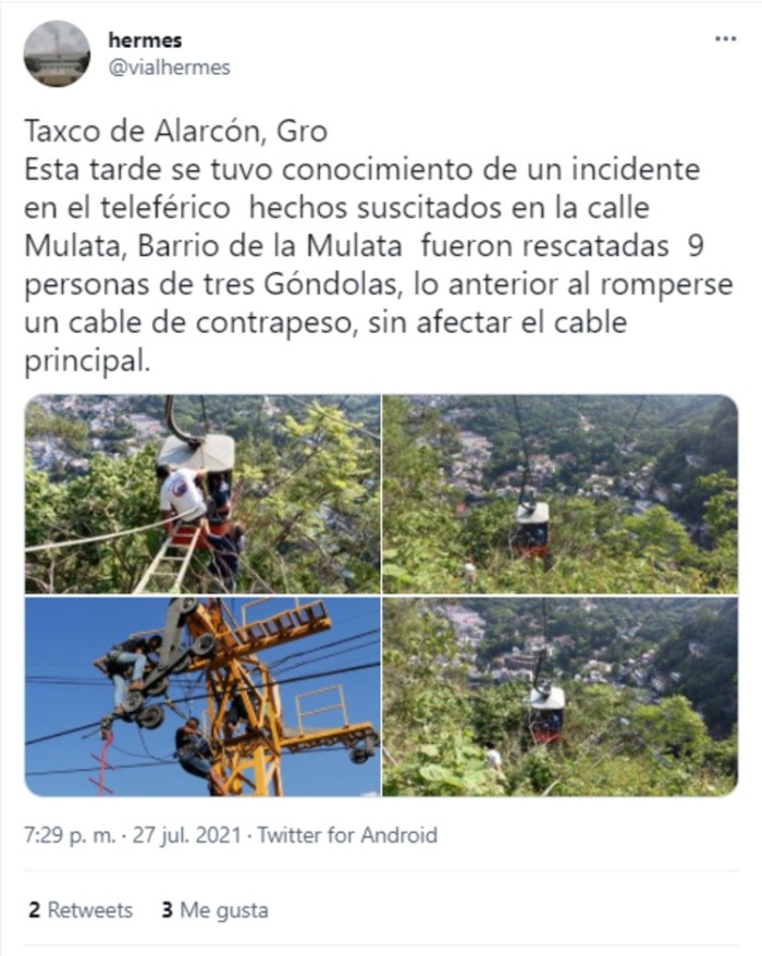 El pasado martes, nueve integrantes de una familia vivieron momentos de terror al quedar varados en tres góndolas, luego de reventarse un cable del teleférico de Taxco, Guerrero. En redes sociales circulan videos del momento en que todos fueron rescatados.La Secretaría de Protección Civil de Guerrero informó que alrededor de las 18:30 horas del martes se recibió una llamada para reportar una falla mecánica en el teleférico de Taxco, por lo que se movilizaron elementos de seguridad para iniciar las labores de rescate, mismas que se extendieron por tres horas.En un video se ve el momento en que las personas fueron rescatadas de las góndolas, que se encontraban a más de 30 metros de altura. Los elementos de rescate se apoyaban sobre los azoteas de las casas aledañas, mientras que uno de ellos se encontraba parado sobre una de las cabinas, auxiliando a los afectados.Uno a uno, los atrapados comenzaron a salir y con ayuda de una soga pudieron deslizarse a un área más segura.Seis hombres y tres mujeres, todos mayores de edad, recibieron atención médica preventiva en el Hospital General del Municipio, y aunque no presentaron lesiones sí reportaron una crisis nerviosa.El Teleférico de Taxco realiza un recorrido de 800 metros, y se encuentra a una altura de hasta 175 metros.De acuerdo con información de Televisa, la dirección de Protección Civil informó que por el momento, el Teleférico de Taxco permanecerá cerrado al público, mientras se realizan trabajos de mantenimiento.Sigue leyendo… Si te interesó esta noticia y quieres saber más, entonces descarga y descubre INFORMAPlus, la aplicación digital de EL INFORMADOR, en donde tenemos contenidos exclusivos, seleccionados por nuestros editores, para darles una experiencia más completa a los lectores.Descarga la aplicación y pruébala GRATIS por treinta días.OF