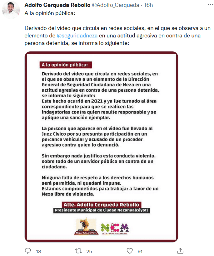 Una nueva joya de internet ha surgido. En esta ocasión se trata de un video donde se ve a un policía municipal de Nezahualcóyotl, del Estado de México, cacheteando a un hombre que se encontraba detenido, y que ya se hizo viral en redes sociales. El clip que ha sido ampliamente compartido por usuarios muestra a un policía en lo que parece ser una actitud conciliadora, pues aparentemente trata de tranquilizar al detenido, sin embargo, éste sólo se altera más a lo que el policía le da una fuerte cachetada. Conmocionado, el detenido se toca la cara y devuelve la cachetada al policía, que por supuesto, se muestra alterado, pero el video se termina y no se ve en qué quedaron las cosas.Según se mencionó en redes sociales, el policía agresor es el jefe de turno del Sector uno de la Policía Nezahualcóyotl. Después de que se viralizara el clip de la agresión, el presidente municipal de Nezahualcóyotl, Adolfo Cerqueda Rebollo, tuvo que salir a aclarar que se trataba de un hecho ocurrido en el año 2021, sin embargo, el caso ya “fue turnado al área correspondiente para que se realicen las indagatorias contra quien resulte responsable y se aplique una sanción ejemplar”. Además, el alcalde explicó que el hombre fue detenido por su presunta participación en un percance vehicular y acusado de actuar agresivamente. “Ninguna falta de respeto a los derechos humanos será permitida, ni quedará impune”, finalizó el comunicado que compartió Cerqueda. GC