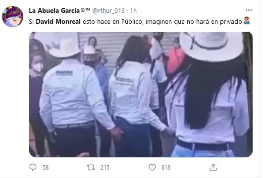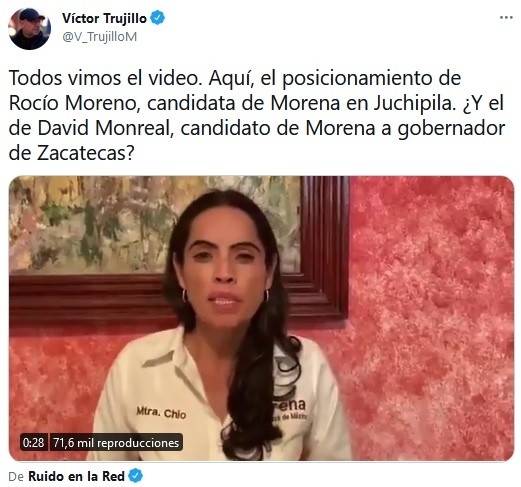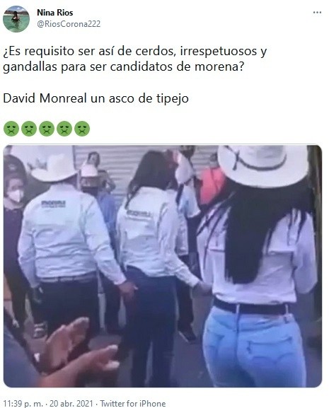 El candidato de Morena a la gubernatura de Zacatecas, David Monreal, fue captado “manoseando” a una mujer durante un mitin de campaña en el municipio de Juchipila, del mencionado estado.En el video, de pocos segundos, se ve cómo el candidato morenista se acerca hacia la mujer, ambos rodeados por simpatizantes, y le pellizca la pompa. Ante esto, ella sólo actúa sorprendida, pero no hace ni dice nada.Después de que se viraliza el video, donde cientos de usuarios de redes condenaron la actitud de Monreal, se identificó a la mujer que aparece en el video. Se trata de Rocío Moreno, candidata de Morena a la presidencia municipal de Juchipila.Moreno, rápidamente salió a defender al político, y publicó un video donde afirma que no permitirá que la utilicen para “dañar al movimiento”.“El licenciado David Monreal es una persona respetuosa y nunca me ha faltado. Basta de calumnias. Basta de utilizar los videos para dañar nuestras imágenes”, sentenció.A diferencia de su compañera, David Monreal no ha mostrado su postura sobre el video que ha sido compartido ampliamente por los internautas.