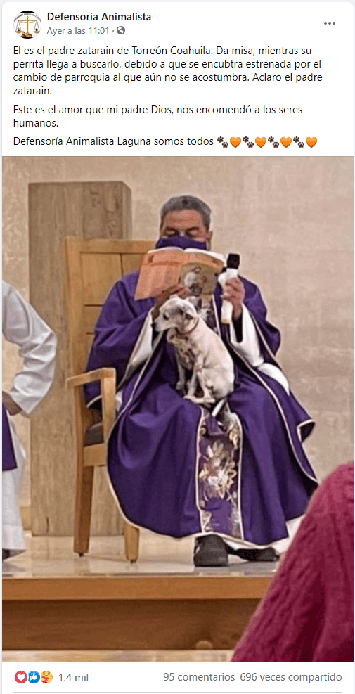 Que su mascota desorientada haya corrido hacia el interior de la parroquia en la que ahora oficia no fue impedimento para que el padre Zatarain continuara la misa a causa de una distracción, e hizo parte de la eucaristía a su perrita en Torreón, Coahuila, en donde el particular momento fue captado por algunos fieles.Según dio a conocer la Defensoría Animalista en una publicación en Facebook, el sacerdote se encontraba en medio de su compromiso religioso cuando la perrita ingresó en su búsqueda, ya que no se encuentra acostumbrada aún a la nueva parroquia a la que ambos han sido asignados. Otra versión de los feligreses apunta a que el animalito está enfermo y no podía mantenerse sin vigilancia.La imagen del religioso con su mascota en su regazo rápidamente ha sido compartida cientos de veces y se llena de comentarios que aplauden el gesto.