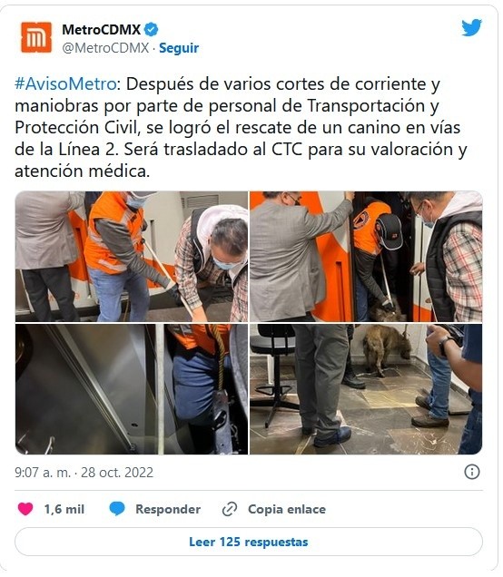Un perro causó nerviosismo entre usuarios al sortear el paso del tren, pues corría delante del convoy en la estación Guerrero de la línea B del Metro.Lo anterior llevó a suspender el servicio, pues el perrito dentro de su temor iba sobre el balasto desde la estación Buenavista y La Lagunilla.En el video difundido en redes se aprecia a un perro color blanco corriendo delante del tren, ante la expectativa de la gente."Se realiza un corte de corriente y maniobras para rescatar a un perrito en vías de la Línea B. En breve se normalizará el servicio", dijo el STC Metro.El servicio se normalizó a las 18:05 horas.JM