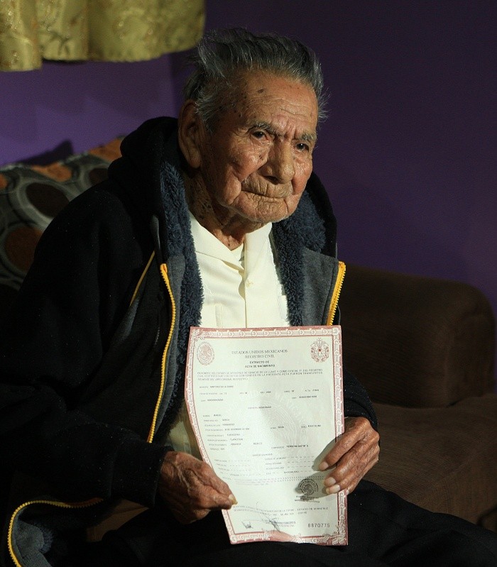 En la Nochebuena de 1896 nació el que hoy podría ser el hombre más longevo del mundo, el mexicano Manuel García. A sus 124 años, tal y como refleja su acta de nacimiento, reside en la fronteriza Ciudad de Juárez y da algunos consejos para vivir tantos años: trabajo duro y llevar una vida sin vicios.Esta semana, don Manuel García ganó notoriedad cuando el Presidente de México, Andrés Manuel López Obrador, lo felicitó en un video por Twitter: "Él tiene 124 años, un siglo y cuarto".Recordó que el hombre vivió la Revolución mexicana, que comenzó en 1910, y "todavía tenemos la dicha de que está entre nosotros"."Ningún presidente hace esto de saludar a los pobres", dice este sábado don Manuel, desde su humilde casa en Ciudad Juárez y acompañado de su hija Tomasa.Con una sonrisa y una mirada alegre, Manuel recuerda con emoción su estado natal, su querido Veracruz, en el este del país.Según el acta de nacimiento que tiene entre sus arrugadas manos, nació el 24 de diciembre de 1896, en el municipio de Tlapacoyan, donde vivió casi toda su vida.A los nueve años comenzó a emplearse como agricultor. Desde temprana hora alimentaba a los animales antes de que amaneciera, y se acostaba tarde siempre pendiente de los cultivos.No fue hasta los 100 años que abandonó por completo el campo y se trasladó a Ciudad Juárez para vivir con una de sus hijas.Con una sonrisa en su cara, se le ve feliz cuando recuerda su vida de campesino, entre sembradíos y la crianza de gallinas, vacas y caballos, que le gustaba montar.Presenció un México muy diferente al de ahora, que recuerda con nostalgia. Especialmente la música de su época, donde sonaba mucho la guitarra y el violín."Cuando era el día del santo de alguien íbamos a su casa y le tocábamos 'Las Mañanitas'. No había luz en las calles, solamente los candiles iluminaban", explicó.Ha vivido por grandes momentos históricos tanto nacionales, como la Revolución mexicana, o mundiales, como la llegada del hombre a la Luna (1969).Para don Manuel, el mejor presidente de México fue Plutarco Elías Calles (1924-1928). "Él ayudaba a la gente del campo, se hacía una petición y él atendía las necesidades".Aunque con el caminar lento por los años, su vista cansada y las manos de un hombre dedicado al campo durante décadas, Manuel conserva la lucidez y da algunas recomendaciones para quien quiera vivir tanto como él: trabajar."A los jóvenes, que no se pierdan en vicios, en aguardientes, que trabajen, coman bien y no quieran cuidarse ya cuando estén enfermos", subrayó.Manuel contrajo matrimonio a los 45 años con Rosa Medino, que apenas tenía 13 años. Tuvo 17 hijos, de los cuales le sobreviven hoy en día cuatro, y 40 nietos.Ella murió hace 10 años en Veracruz y por la preocupación de cuidar su salud, su hija Tomasa García llevó a don Manuel a Ciudad Juárez, para así estar al pendiente de sus cuidados.Tomasa tiene 57 años y se despierta a las cuatro de la mañana para dejarle comida preparada antes de ir a trabajar a una empresa maquiladora.Con los ojos llorosos, cuenta que su padre le pide que ya no vaya al trabajo y que esté de tiempo completo al pendiente de él. "Me dice que no me vaya, que cualquier día que regrese ya no lo voy a encontrar".Sin embargo, mientras ella cumple con su jornada laboral, los nietos de don Manuel van periódicamente a verlo y están al pendiente de su bienestar.El cuarto de don Manuel es una recámara pequeña, pero está pintada de colores alegres. Y tiene todo lo necesario para mitigar el frío de la temporada, una manta eléctrica y varias cobijas.Desde su casita y arropado por los suyos, don Manuel pasa los días ajeno a la pandemia de coronavirus que azota el planeta. Aunque lleva tiempo sin apenas salir del hogar para evitar contagios.Y aunque puede ser el hombre más viejo del mundo, su familia no tiene ningún interés en lograr un récord Guinness.La prioridad es salvaguardar su salud y bienestar, y seguir aprendiendo de él.OF