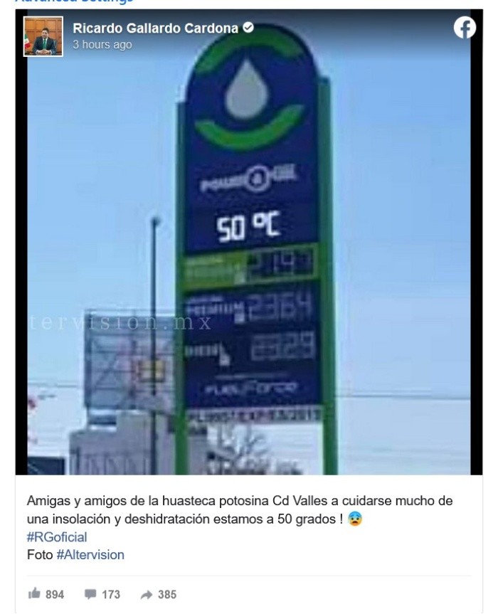 ¿Qué tal el calor? Esta temporada no es raro que se rompan los récords de altas temperaturas en varios estados de México, y en esta ocasión usuarios de redes sociales resaltaron el caso en particular de Ciudad Valles, San Luis Potosí.En Twitter circula una fotografía en la que según una gasolinera, la temperatura en Ciudad Valles es de 50 grados, cuando el pronóstico para hoy era de 43.El gobernador de San Luis Potosí, Ricardo Gallardo, llamó a la población, especialmente de la región de la Huasteca, a cuidarse y mantenerse hidratado."Amigas y amigos de la huasteca potosina Cd Valles a cuidarse mucho de una insolación y deshidratación estamos a 50 grados", posteó el mandatario estatal en su cuenta de Facebook.JM