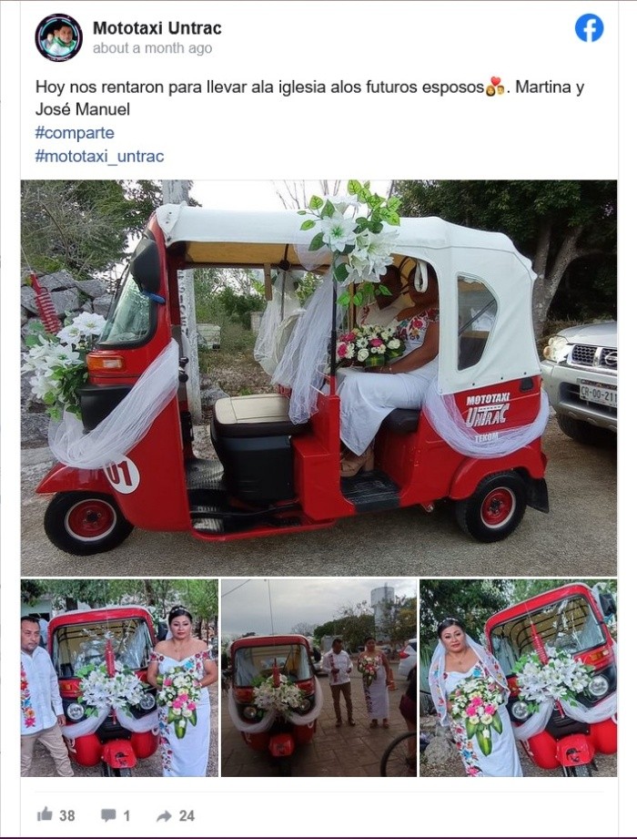 Una pareja de novios no tardó en viralizarse en las redes sociales, pues de manera ingeniosa convirtieron un mototaxi en su carruaje de bodas.La creatividad de los yucatecos Martina y Juan Manuel los volvió virales tras presumir el día más esperado de sus vidas: su boda.Ella, con un vestido color blanco con flores de colores y detalles en el velo, mientras que él con un pantalón beige y una tradicional guayabera, se mostraron felices por el gran paso realizado; sin embargo, lo que más causó sorpresa fue el vehículo que usaron para llegar hasta la iglesia.Se trata de una moto adaptada para trasladar pasaje, mejor conocida como mototaxi. Con flores y tela de tul, la pareja le dio ese toque romántico a lo que sería el carruaje que los pasearía por Chichimilá, ubicado en el oriente del Estado y que forma parte de los 106 municipios de Yucatán.JM