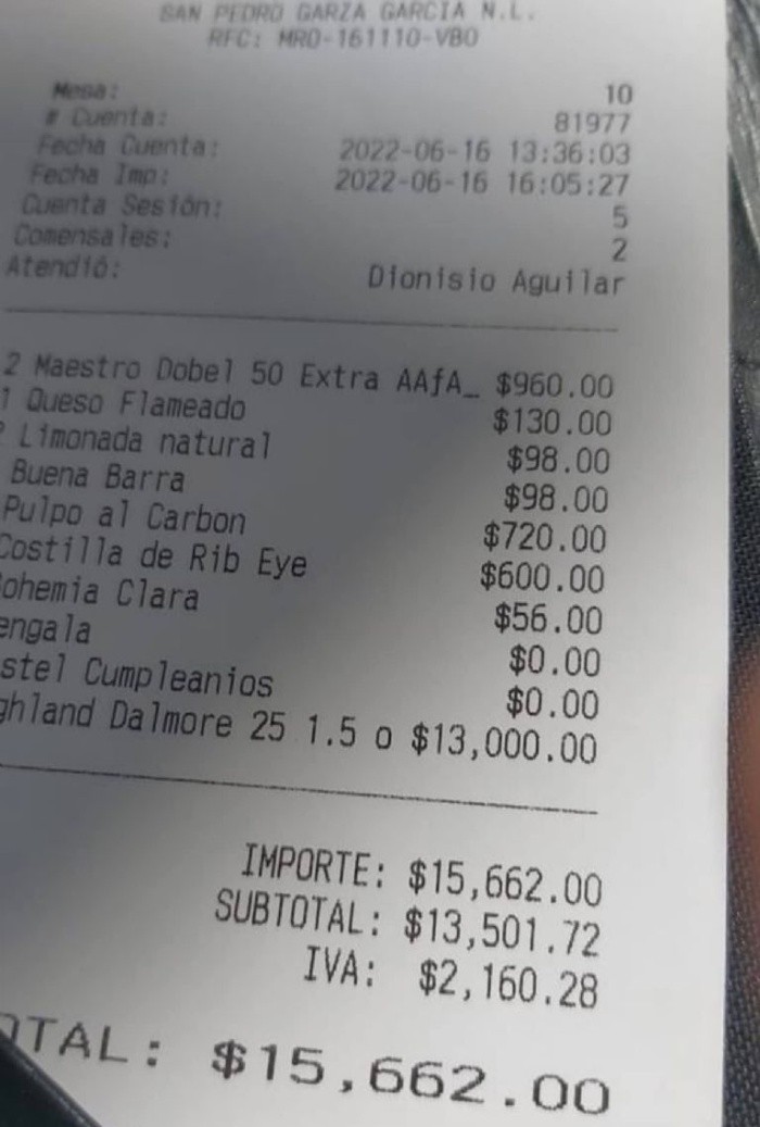 Los festejos de cumpleaños suelen estar acompañados de buenos momentos que después se traducen en anécdotas. Algunas pueden ser positivas y otras negativas. En el caso de Karla González, le tocó vivir una experiencia que jamás olvidará, luego de que en un restaurante le quisieron cobrar un shot en 13 mil pesos. En Monterrey, Nuevo León, se presentó el peculiar caso que Karla González reportó a través de su Facebook. La usuaria señaló que visitó el restaurante La Buena Barra para celebrar el cumpleaños de su acompañante. Con lo que ella no contaba es con que intentarían cobrarle un shot muy por encima del precio imaginado. Karla relató su experiencia. La joven detalló que contaban con un presupuesto de 4 mil pesos aproximadamente y antes de acudir al lugar habían revisado el menú con los precios para cualquier inconveniente.La sorpresa para Karla y sus acompañantes vino cuando junto al pastel, uno de los meseros les habría ofrecido Whisky con mucha insistencia sin indicarles los precios y el festejado finalmente eligió el shot que le saldría en 13 mil pesos. "Al llegar todo bien, quisimos beber 1 tequila (fue lo mas caro) y luego normal, limonada, cerveza, nuestros platillos fuertes. ¡Sorpresa! cuando llegó el pastel y nos ofrecieron whisky, nos pusieron varios, nos dieron a oler, el mesero estaba súper insistente y al final Nelson eligió un Dalmore 25, sí error", relató. Karla explicó que en su defensa, ni el producto ni el precio venían incluidos en el menú y que tampoco el mesero les informó del costo; de lo contrario no habrían elegido ese shot. Aunque insistieron en hablar con el gerente, no encontraron respuesta en más de 6 horas de espera y la única solución que les ofrecían era que pagaran el shot. "Hablamos con el capitán de meseros que solo nos dijo que solo era engaño si nosotros pedíamos una cosa y se nos entregó otra, pero si no nos dijo precio, no lo era", dijo. "El capitán de meseros mencionó unaaaa y otra veeeez que había gente que tomaba copas de 30 mil pesos, y que se ofendía si él les mencionaba el precio, yo le dije que no era mi caso y que solo era una ocasión especial, ya que no acostumbro a ir a lugares caros por hobbie, agregó Karla. Al final, Karla concluyó su historia asegurando que aprendió la lección: es mejor ir a los taquitos de la esquina. JL