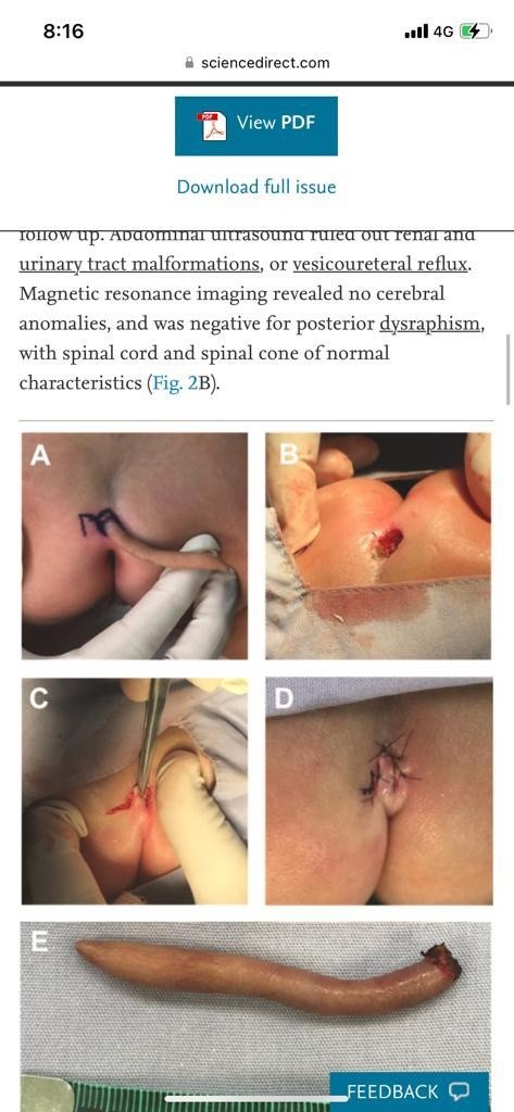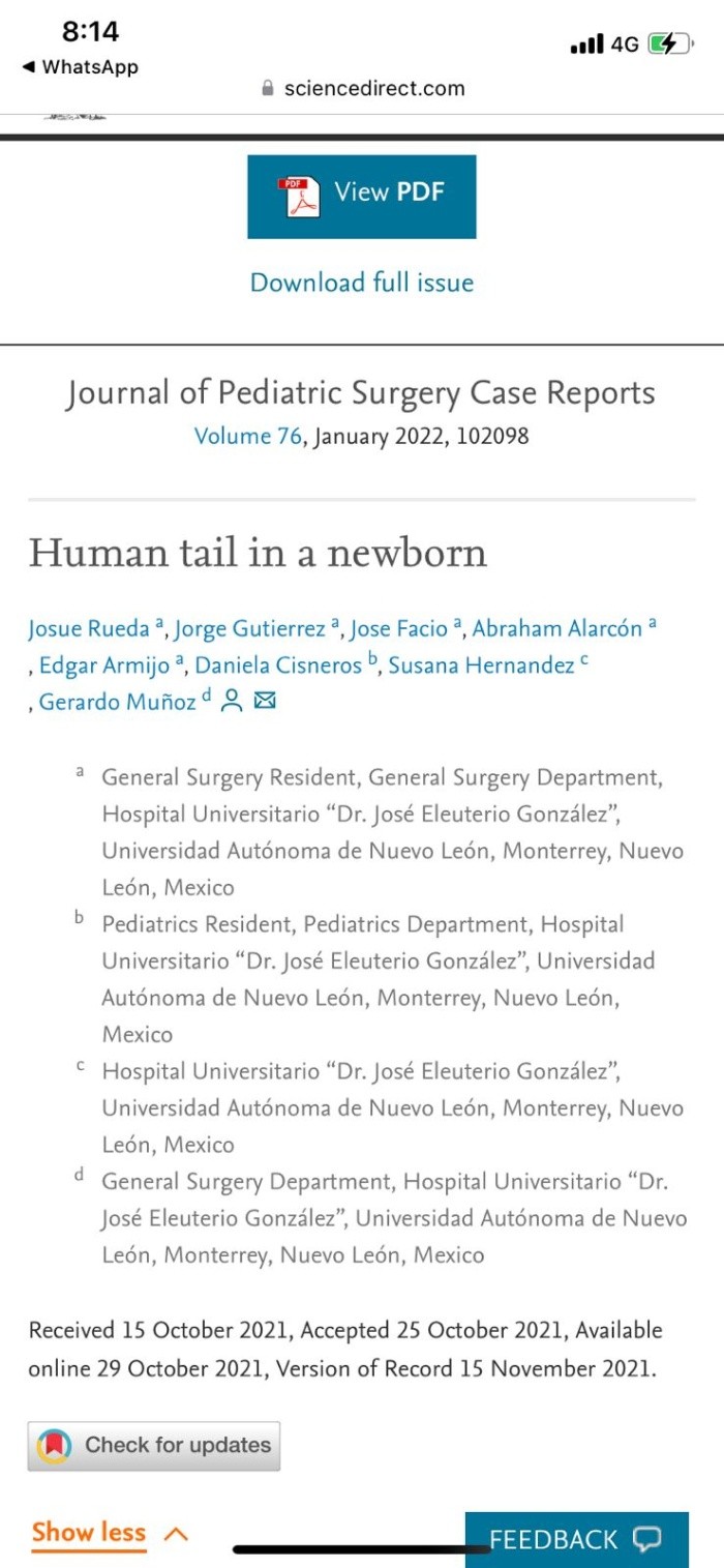 En Nuevo León se registró el insólito nacimiento de una bebé con una cola que llegó a medir cerca de seis centímetros de largo, según un artículo publicado en el Journal of Pediatric Surgery Case Reports.De acuerdo con la publicación, el nacimiento se registró con normalidad: una cesárea en un hospital rural, con padre y madre sanos y que no eran parientes; asimismo, ya habían tenido un hijo que nació sano.El embarazo de la madre no presentó complicaciones y no hubo registro de exposición a radiación o a teratógenos, detallan profesionales que analizaron el caso.Al nacer, los doctores detectaron que la recién nacida presentaba una estructura en forma de cola de 5.7 cm de longitud y de entre tres y cinco milímetros de diámetro. La extremidad se encontraba en la hendidura interglútea.La cola era blanda, cubierta de piel y pelo fino, se podía mover pasivamente sin dolor, pero no mostraba ningún movimiento espontáneo. Los médicos procedieron a pellizcar la extremidad con una aguja. Esto hizo que la bebé llorara, por lo que confirmaron una conexión nerviosa.Tras detectar la anomalía, los médicos comenzaron a aplicar diversas pruebas. A través de una radiografía se descartó la evidencia de irregularidades o estructuras óseas dentro de la cola. Además, una ecografía abdominal descartó malformaciones renales y del tracto urinario, o reflujo vesicoureteral.Asimismo, la resonancia magnética practicada no reveló anormalidades cerebrales, además, fue negativa para disrafismo posterior, y presentó médula espinal y cono medular de características normales. Entretanto, la exploración auditiva y cardíaca fue normal, por lo que la pequeña fue dada de alta para seguimiento ambulatorio.Tras cumplir dos meses, la menor fue revaluada por el equipo de pediatría y cirugía general, mismos que encontraron que la cola había crecido 0.8 centímetros, por lo que la extremidad fue extirpada y la zona afectada fue reconstruida mediante plastia de Limberg.Una vez separado el tejido del cuerpo de la bebé, la cola fue sometida a varios análisis en los que se reveló que la muestra contenía tejido blando, incluyendo tejido fibroadiposo, estructuras vasculares y haces nerviosos, cubiertos por piel, sin alteraciones histopatológicas.De acuerdo con la publicación de la edición de enero del Journal of Pediatric Surgery Case Reports, la pequeña fue dada de alta y no se registraron complicaciones en el seguimiento de su estado de saludJM