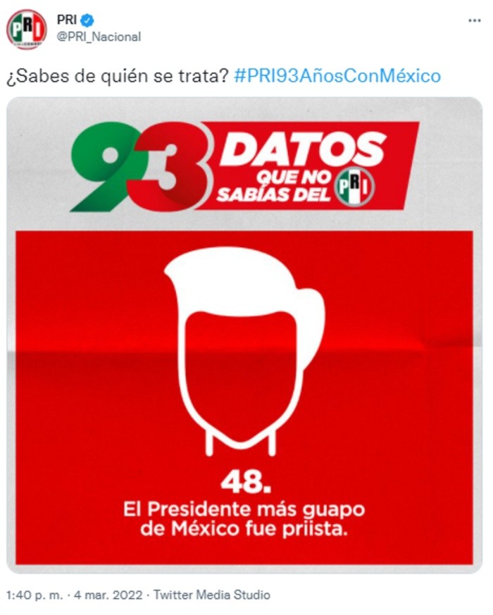 Este viernes 4 de marzo, la cuenta de Twitter del Partido Revolucionario Institucional (PRI) se volvió blanco de críticas, luego de que en su sección "93 datos que no sabías del PRI" se publicara un mensaje "curioso" que se volvió viral. En su dato número 48 por la celebración de los 93 años del partido, la cuenta de Twitter informó que "El Presidente más guapo de México fue priista", lo que desencadenó una serie de todo tipo de comentarios.El PRI fue fundado el 4 de marzo de 1949 bajo el nombre de Partido Nacional Revolucionario (PNR) por el entonces presidente Plutarco Elías Calles, y estuvo en el poder desde 1930 hasta el año 2000, y luego regresó en 2012, cuando fue elegido el ex gobernador del Estado de México Enrique Peña Nieto, el que según los usuarios es el personaje al que se refiere el polémico tuit.OF
