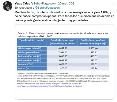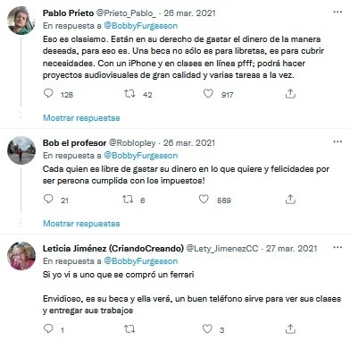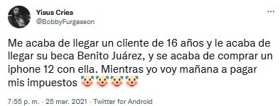 Un usuario de Twitter de apodo @BobbyFurgesson expuso a un adolescente de 16 años que gastó su beca Benito Júarez para comparse un Iphone 12. Sin embargo, fue criticado por otros usuarios, pues señalan que es imposible adquirir un celular de esa gama con el dinero que da el programa."Me acaba de llegar un cliente de 16 años y le acaba de llegar su beca Benito Juárez, y se acaba de comprar un Iphone 12 con ella. Mientras yo voy mañana a pagar mis impuestos", escribió en la publicación.Reiteraron que los estudiantes de México que están registrados en el programa reciben mil 800 pesos cada dos meses y el Iphone 12 tiene un costo mínimo de 19 mil pesos. La publicación se hizo viral y obtuvo más de siete mil reacciones y cientos de comentarios negativos, pues la mayoría criticaron el post y algunos indicaron que "cada quien era libre de gastar su dinero en lo que quisiera" y defendieron al joven. Además, el usuario respondió a las criticas y expone que "un interno de medicina gana 1,807 y no puede comprar un Iphone"."Mientras tanto, un interno de medicina que arriesga su vida gana 1,807, y no se puede comprar un iphone. Para todos los que dicen que no decida en qué se puede gastar el dinero la gente...hay prioridades".Todos los estudiantes de México pueden recibir el apoyo económico que ofrece el programa del gobierno de Andrés Manuel López Obrador (AMLO) y es dirigido para fortalecer la educación en el país.La Beca Benito Juárez consiste en un pago de 800 pesos mensualmente, sin embargo el representante de la Coordinación Nacional de Becas para el Bienestar Benito Juárez (CNBBBJ), Abraham Vázquez Piceno, informó que el apoyo se otorgará de manera bimestral, por lo que cada estudiante recibirá mil 600 pesos cada dos meses.jb