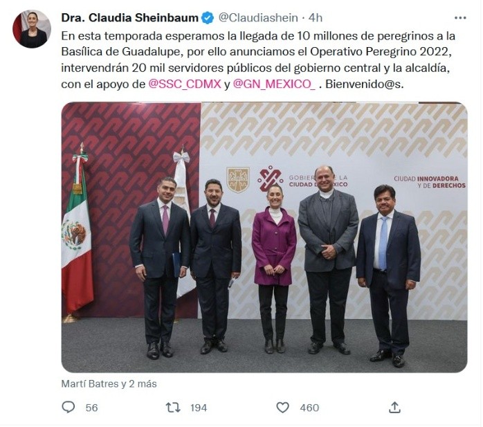 “Estamos esperando muchos peregrinos este año dado que fueron dos años, un año en donde no estuvo abierta la Basílica y otro año en donde fue una celebración especial. Se esperan alrededor de 10 millones de personas, poco más, que vayan a visitar la Basílica ahora, que vayan a celebrar a la Virgen”, señaló Claudia Sheinbaum, jefa de Gobierno de la Ciudad de México al anunciar el operativo “Bienvenido Peregrino 2022”.Informó que son alrededor de 20 mil servidores públicos entre la alcaldía Gustavo A. Madero y 20 instituciones de gobierno, además del apoyo de la Guardia Nacional, quienes intervendrán en las acciones de vigilancia y atención para salvaguardar a los visitantes a la Basílica de Guadalupe, principalmente los días, 11, 12 y 13 de diciembre."Como siempre, pedirles a todos que se cuiden tanto por las temperaturas frías, como por la llegada que siempre es caminando, de distintos lugares de fuera de la ciudad y de la ciudad; que se cuiden, que tengan mucho cuidado para sobre todo quien va en las noches caminando hacia la Basílica, para que puedan protegerse y vamos a estar en distintos puestos de mando”, exhortó Claudia Sheinbaum.En tanto, Martí Batres Guadarrama, secretario de Gobierno, informó que el estado de fuerza es de 12 mil 163 personas del Gobierno de la Ciudad de México, entre éstas, cinco mil 393 personas de personal operativo, 800 de personal médico, 300 bomberos y 5 mil 670 policías, además de las más de siete mil personas que dependerán de la Alcaldía Gustavo A. Madero.Se tendrán cuatro bases de operación: la Base Morelos, el C2 Móvil, un Base de Protección Civil y la Base Cosmos de la alcaldía.Además de 11 puntos de atención a los peregrinos, organizados en cinco rutas en entradas carreteras, una por Puebla; dos por el norte, por la Carretera Querétaro y por Pachuca; una por el poniente, México-Toluca, y también tendremos el acceso por la carretera de Cuernavaca.En estos puntos, habrá carpas identificadas como puntos de hidratación y entrega de alimentos, de descanso, de servicio médico y entrega de gel antibacterial.En su intervención Omar García Harfuch, secretario de Seguridad Ciudadana destacó que además de los más de 5 mil 600 elementos de seguridad, 19 compañeros de la Policía Turística, apoyarán en los recorridos de prevención, en las inmediaciones del templo Guadalupano, para brindar asistencia a visitantes locales y extranjeros, aunado a la coordinación permanente con el C5 para monitorear las actividades y detectar cualquier acto que pudiera alterar el orden público o atender cualquier llamado de auxilio.En las inmediaciones de la Basílica, desde hoy a las 10:00 de la noche se instalará un puesto de mando para la supervisión de las actividades, y en dicho punto habrá también un despliegue de todas las subsecretarías de la Secretaría de Seguridad Ciudadana; asimismo, darán orientación en este punto a turistas, apoyo a la canalización de quejas y denuncias, y proporcionarán apoyo de interprete a personas que lo requieran.Las autoridades del Gobierno de la Ciudad de México recomiendan a todos los visitantes usar al menos tres capas de ropa, de preferencia de algodón o lana; vigilar a personas adultas mayores, infantes y personas con discapacidad; mantenerse cerca y comunicados de familiares o acompañantes, a fin de evitar extravíos; portar identificación que incluya datos fundamentales de la persona, y ubicar las carpas de servicios de emergencia.De igual manera, se sugiere en materia sanitaria un lavado frecuente de manos, estornudo de etiqueta, no saludar de mano o de beso y abrigarse adecuadamente.JM
