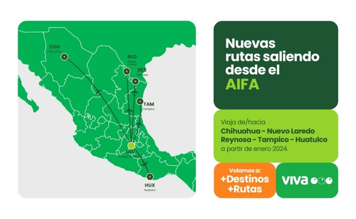 Viva Aerobus informó que este mes inició la operación de cinco nuevas rutas desde el Aeropuerto Internacional Felipe Ángeles (AIFA) hacia los estados de: Chihuahua, Huatulco, Nuevo Laredo, Reynosa y Tampico.Con eso, la aerolínea espera ofrecer más de 4.5 millones de asientos desde este nuevo aeropuerto durante 2024.Las nuevas rutas se dan a conocer, luego del inicio del recorte de operaciones en el Aeropuerto Internacional de la Ciudad de México de 52 a 43 vuelos por hora en horarios saturados.Con estas nuevas rutas ya suman 19 los destinos hacia donde vuela Viva desde el AIFA para atender la demanda de conectividad aérea en la Zona Metropolitana del Valle de México.Cabe destacatar que los vuelos hacia Chihuahua, Reynosa y Nuevo Laredo comenzaron el pasado 8 de enero, por otro lado Huatulco inició ayer y hoy se abrirá la ruta hacia Tampico.NA